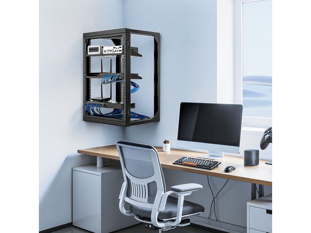 Ez a falra szerelhető hálózati állvány könnyű hozzáférést biztosít a berendezések karbantartásához és cseréjéhez.
