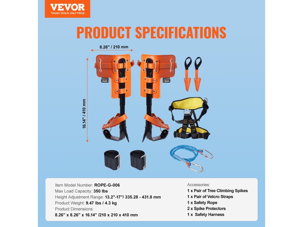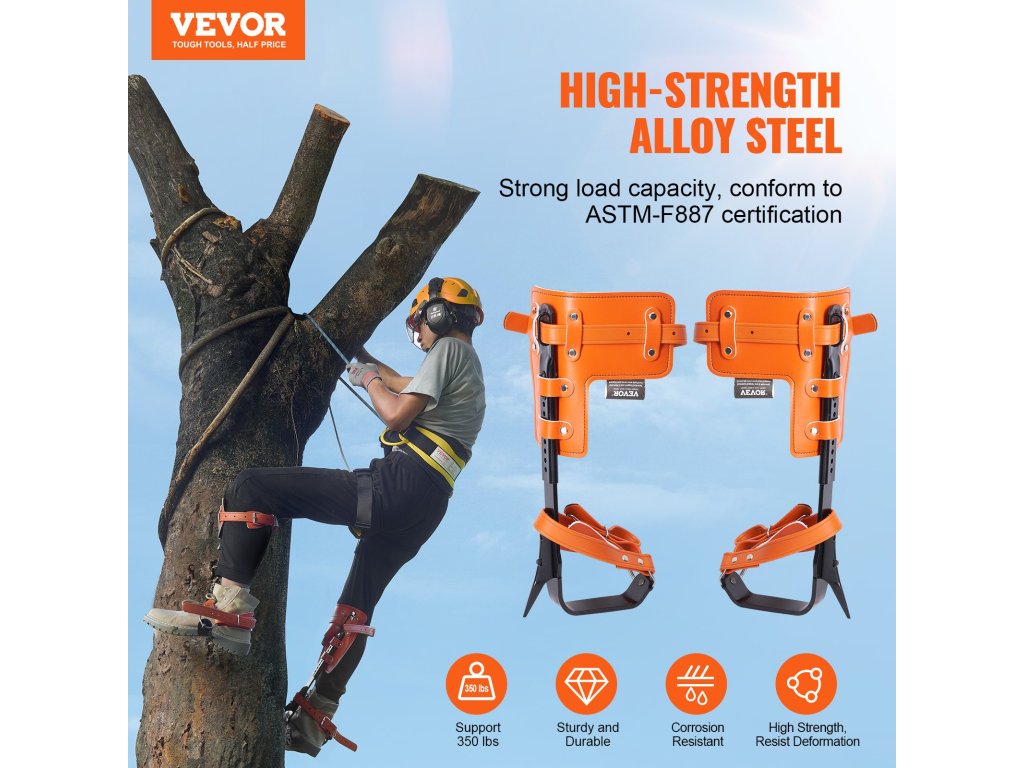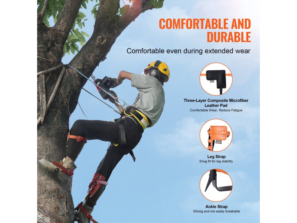 Fára mászó tüskéink erős, nagy teherbírású, nagy szilárdságú ötvözött acélvázzal rendelkeznek. A hevederek a kényelmes és biztonságos illeszkedés érdekében a lábadhoz igazodnak. Kifejezetten magaslati munkákhoz tervezték őket, és ideálisak a fák metszéséhez, gyümölcsszedéshez és rúdmunkához.