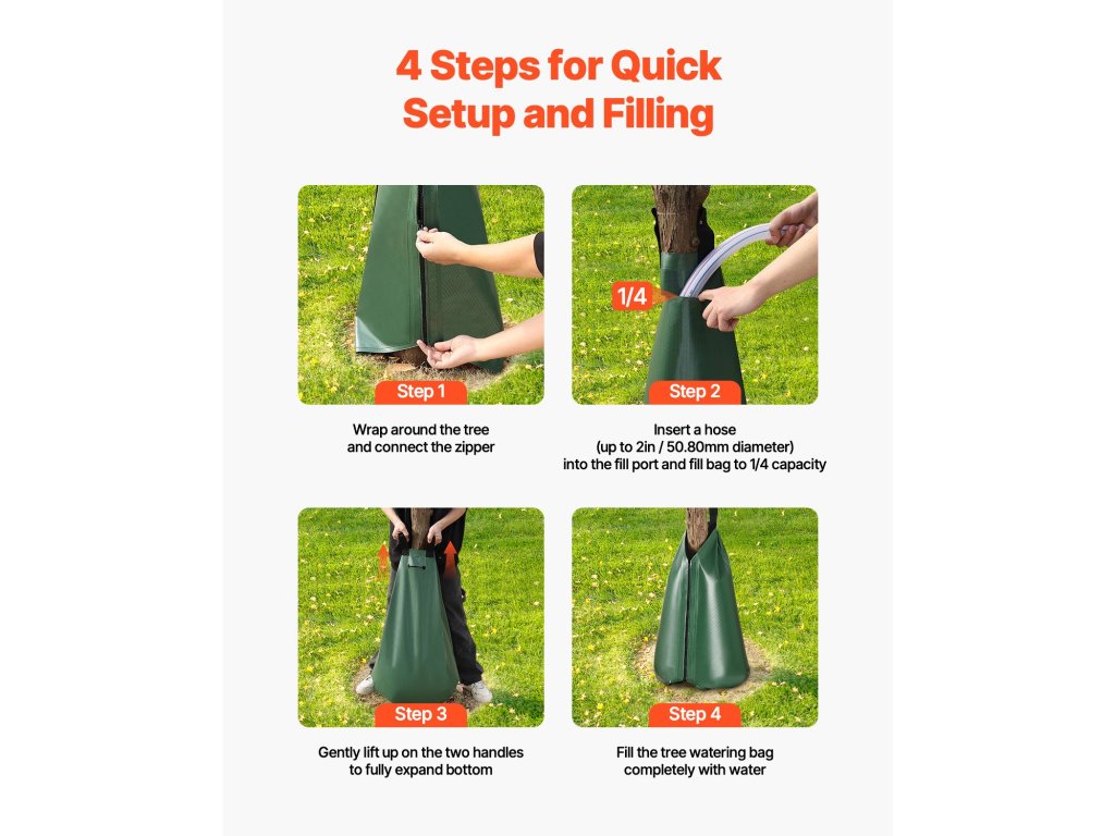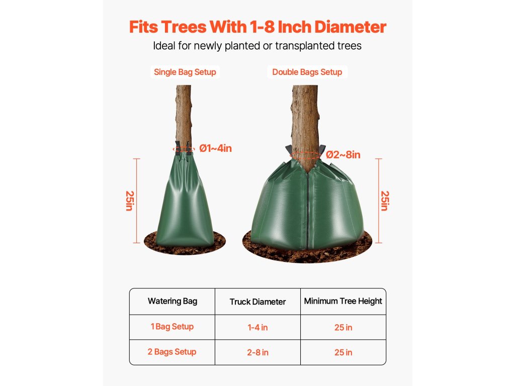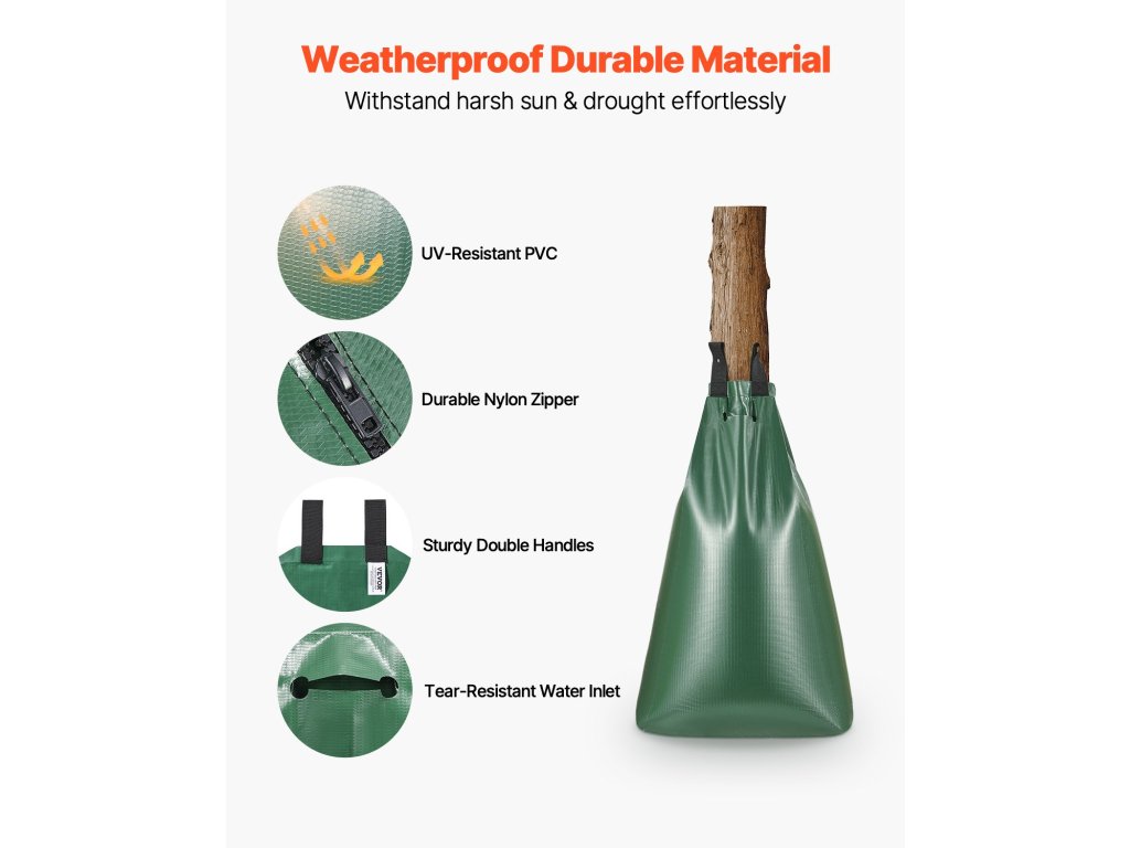 Ez a faöntöző zsák ideális új telepítésekhez vagy szárazságra érzékeny fákhoz a kertekben és gyümölcsösökben, mivel hatékony és stabil öntözést biztosít. A nagy, 75,7 literes (20 gallon) kapacitású zsák lassan, 5-9 óra alatt engedi ki a vizet, hogy mélyen hidratálja a fák gyökereit és elősegítse az egészséges növekedést.