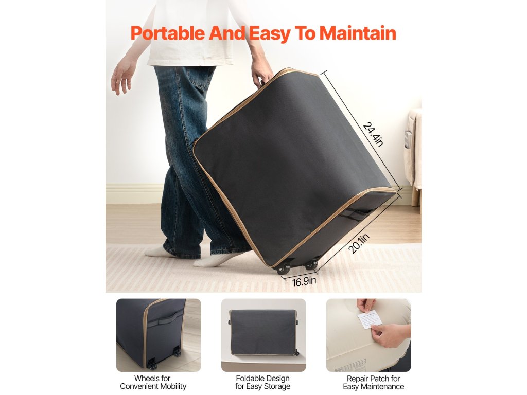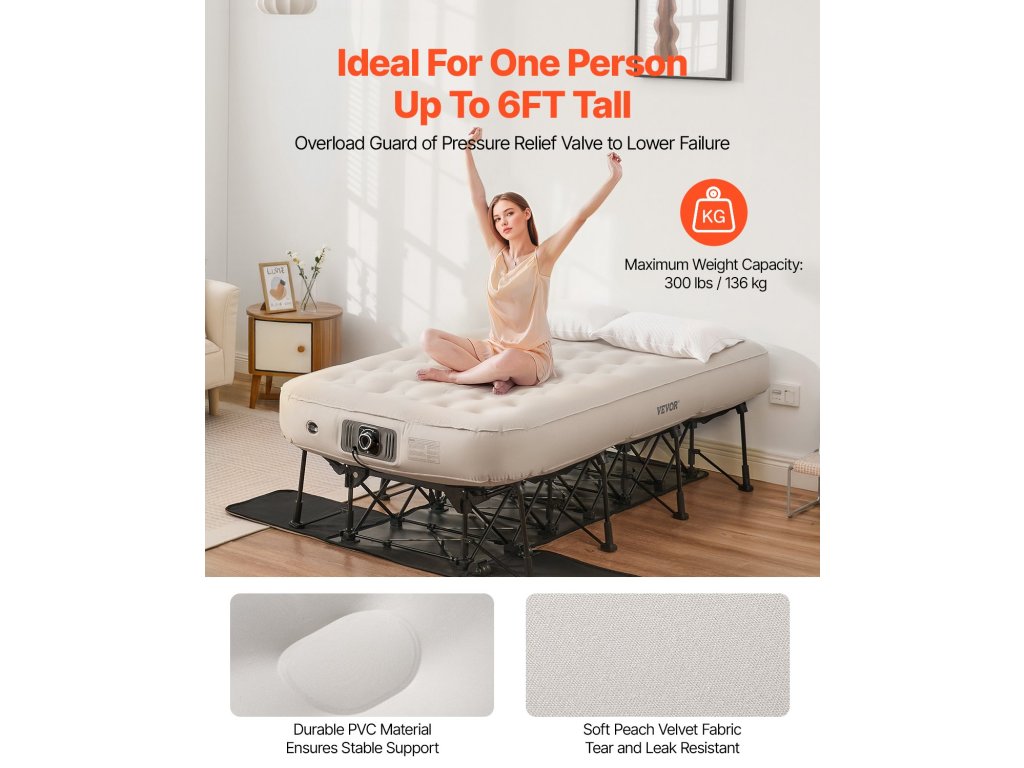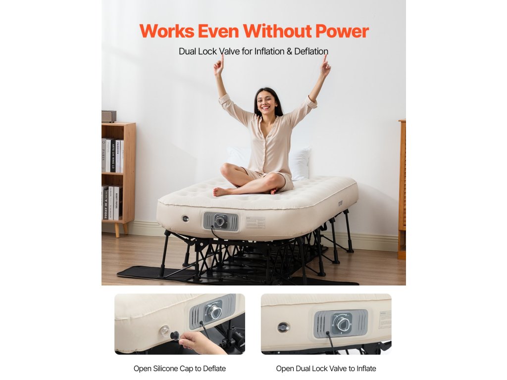 Felfújható kempingágyunk könnyen felállítható: 1. Hajtsa ki, 2. Dugja be, 3. Kapcsolja be a szivattyút. Teljesen felfújódik mindössze 2 perc alatt. PVC-ből és barackszövetből készült, tartós és ellenáll a szakadásnak és a szivárgásnak. A kézi felfúvó/leeresztő szelepnek köszönhetően áramszünet esetén is használható.