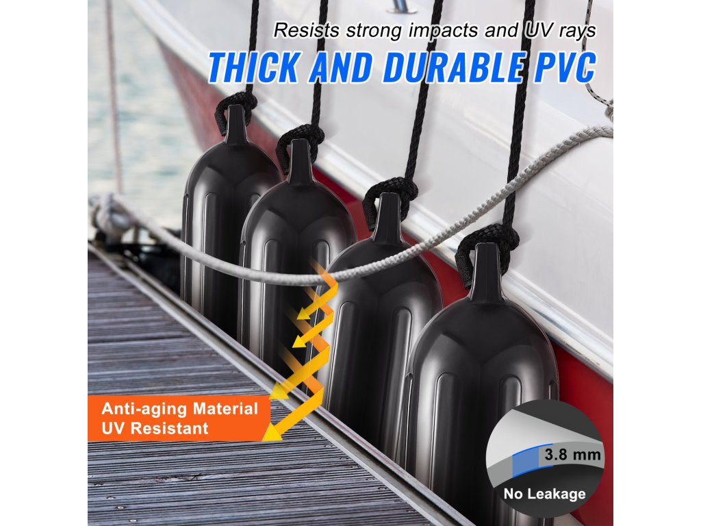 A kiváló minőségű PVC-ből készült, 3,8 mm-es falvastagságú csónakszárnyak csökkentik a légszivárgás és az ütés okozta sérülések kockázatát. Ezek a kiváló minőségű anyagok növelik a fenderek stabilitását, hőállóságát és UV-védelmét, megakadályozva a repedezést és az öregedést még hosszabb napsütés esetén is.