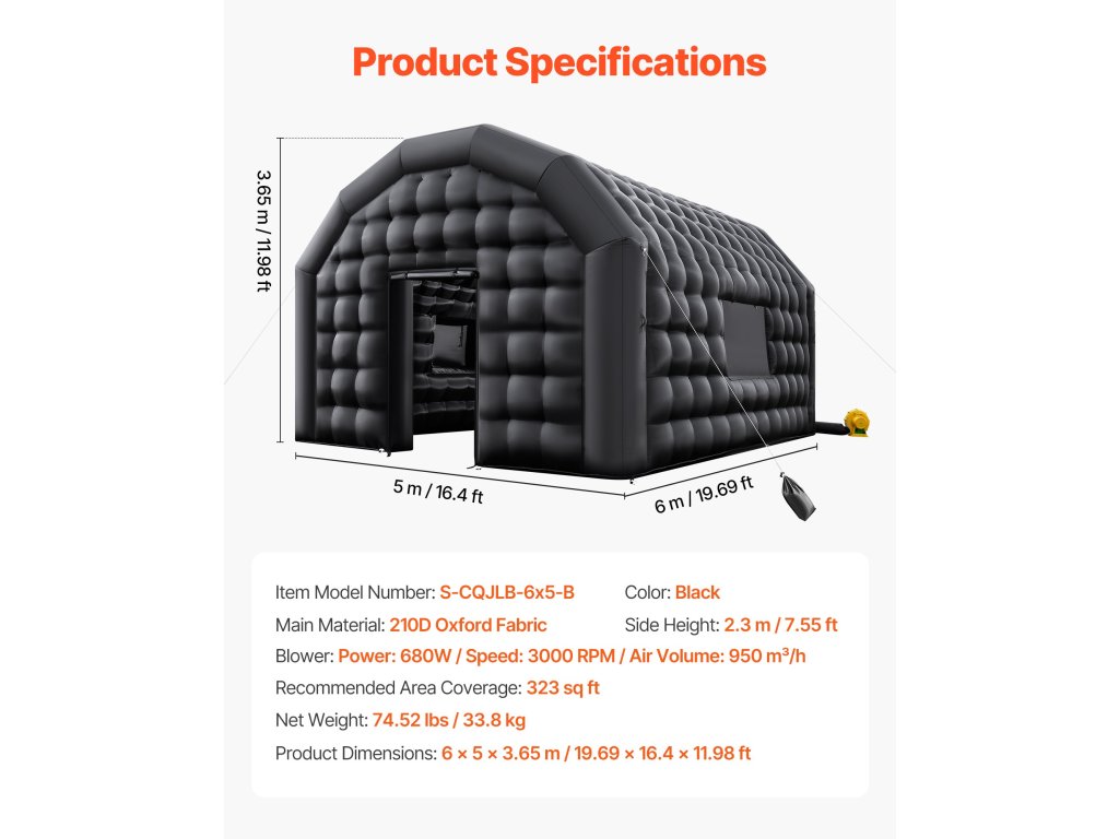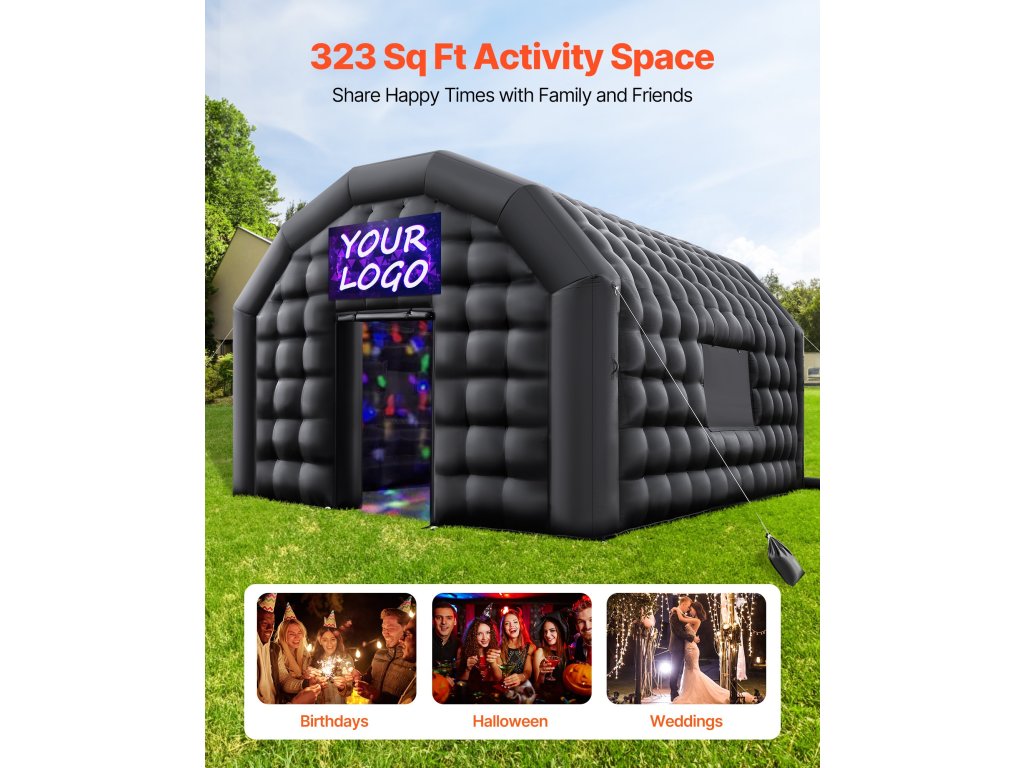 Ez a 323 m²-es felfújható sátor nagy teret kínál esküvők, születésnapok, Halloween és epikus partik számára. Gyorsan felállítható és összepakolható, kompatibilis a diszkóvilágítással, tartós oxfordi anyaggal és megerősített stabilitással rendelkezik, így megbízható partnere lehet bármilyen partin.