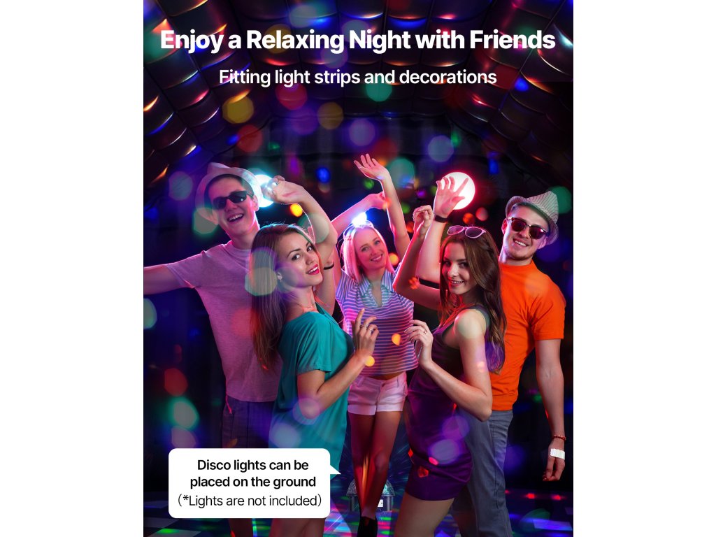 Megerősített varrással, 8 vas és 8 műanyag talajszöggel és homokzsákokkal tervezték, így ez a felfújható éjszakai klub még kültéri körülmények között is stabil marad.
