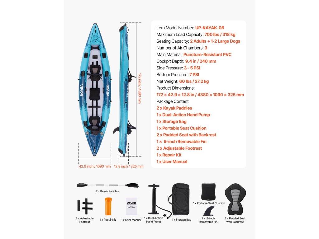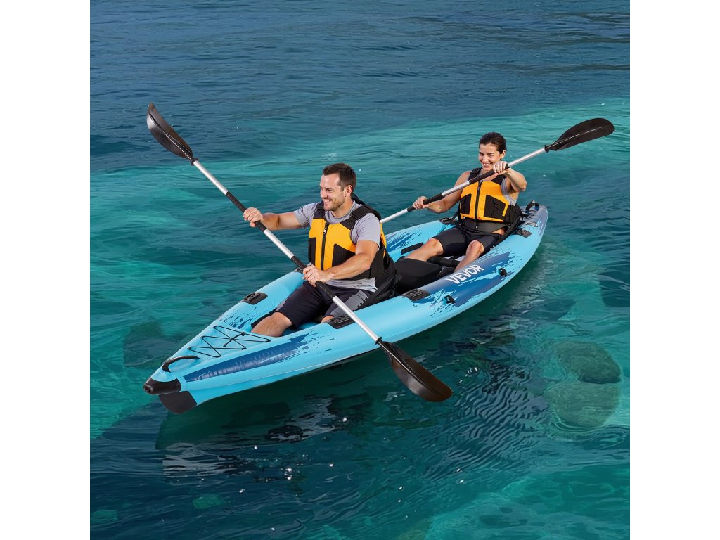 Ez a felfújható kajak egyesíti magában az erős teherbírást, a rugalmas kezelhetőséget, a szilárd konstrukciót, a kényelmes ülést és a könnyű felfújást. Kopás- és lyukálló, akár 700 fontot (318 kg)) is elbír, könnyen elfér benne 2 felnőtt és 1-2 nagytestű kutya, valamint sima és élvezetes evezést biztosít.