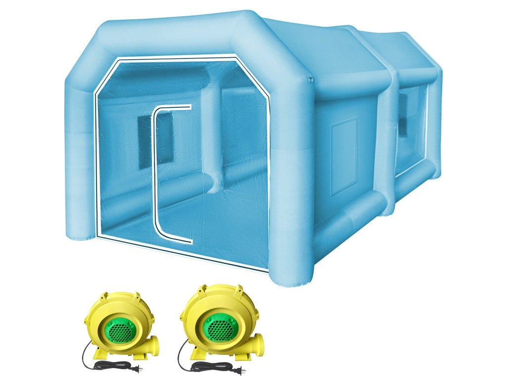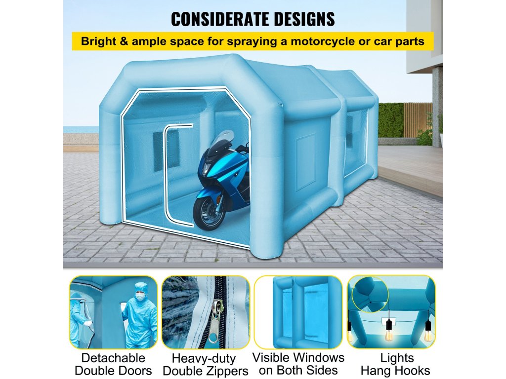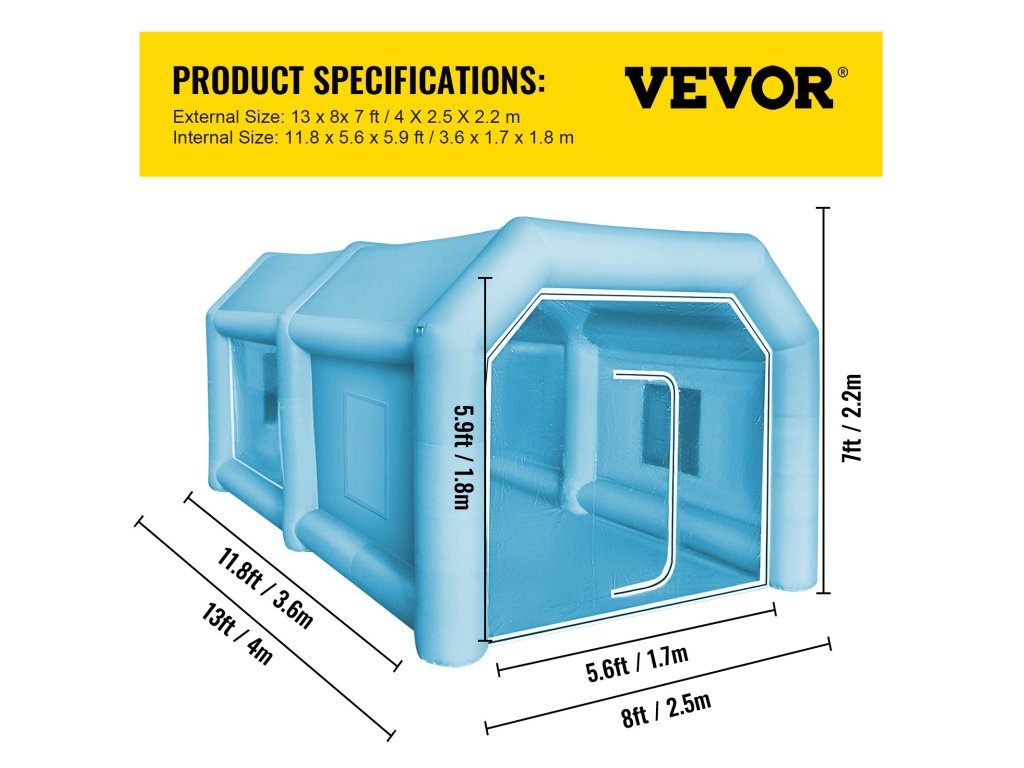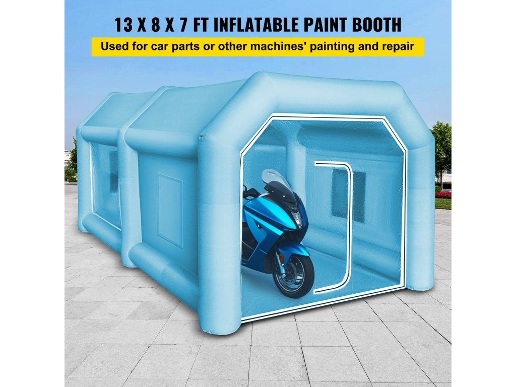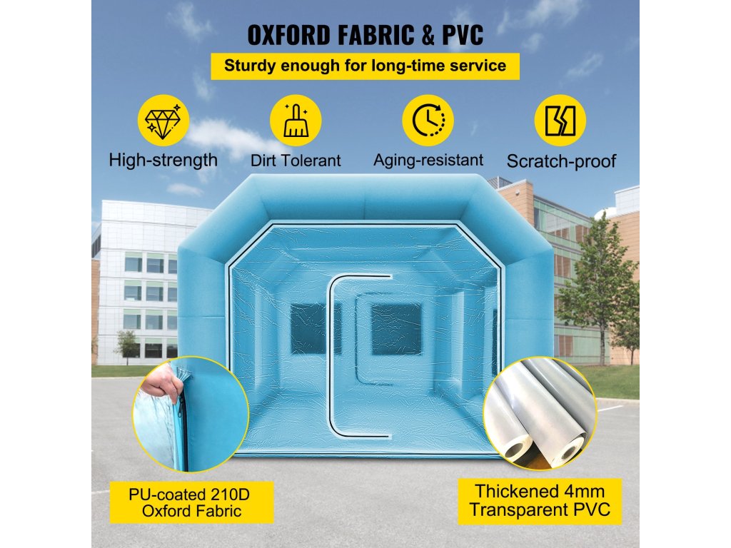 A felfújható festőkabin Oxford 210D szövetet és PVC anyagot használ, amely tartós, szakadásálló és szennyeződésálló. Külső méretei: 13 x 8 x 7 láb. Elég tágas egy autó vagy motorkerékpár festéséhez.