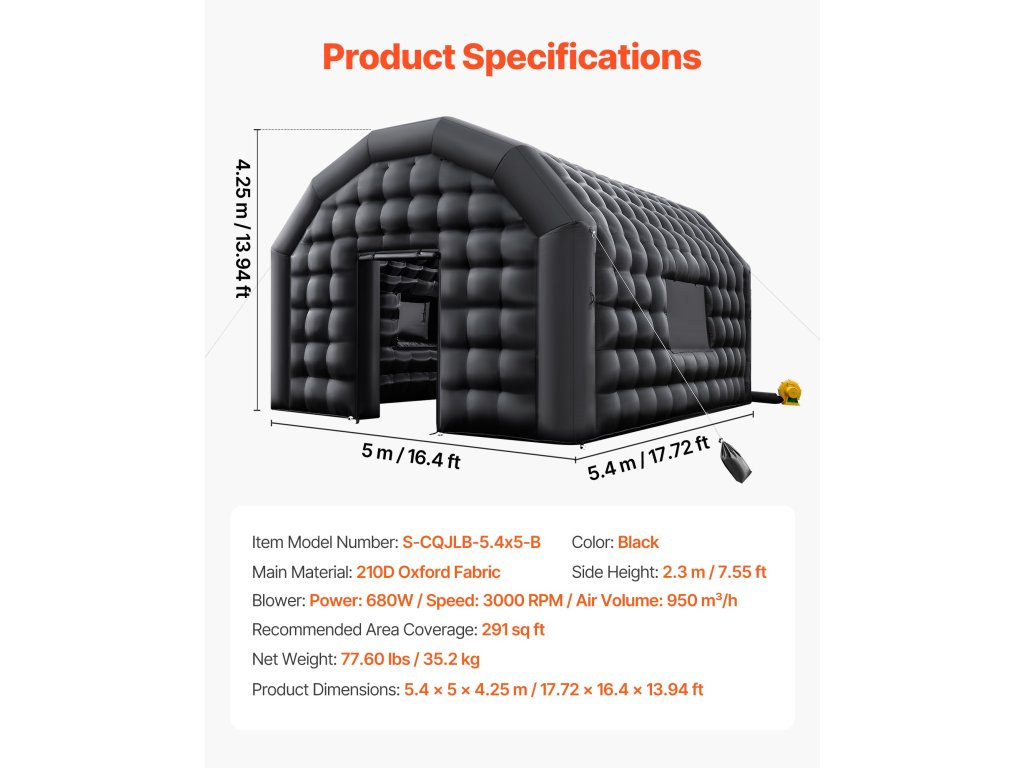 Ez a 291 m²-es felfújható sátor nagy teret kínál esküvők, születésnapok, Halloween és epikus partik számára. Gyorsan felállítható és összepakolható, kompatibilis a diszkóvilágítással, tartós oxfordi anyaggal és megerősített stabilitással rendelkezik, így megbízható partnere lehet bármilyen partin.