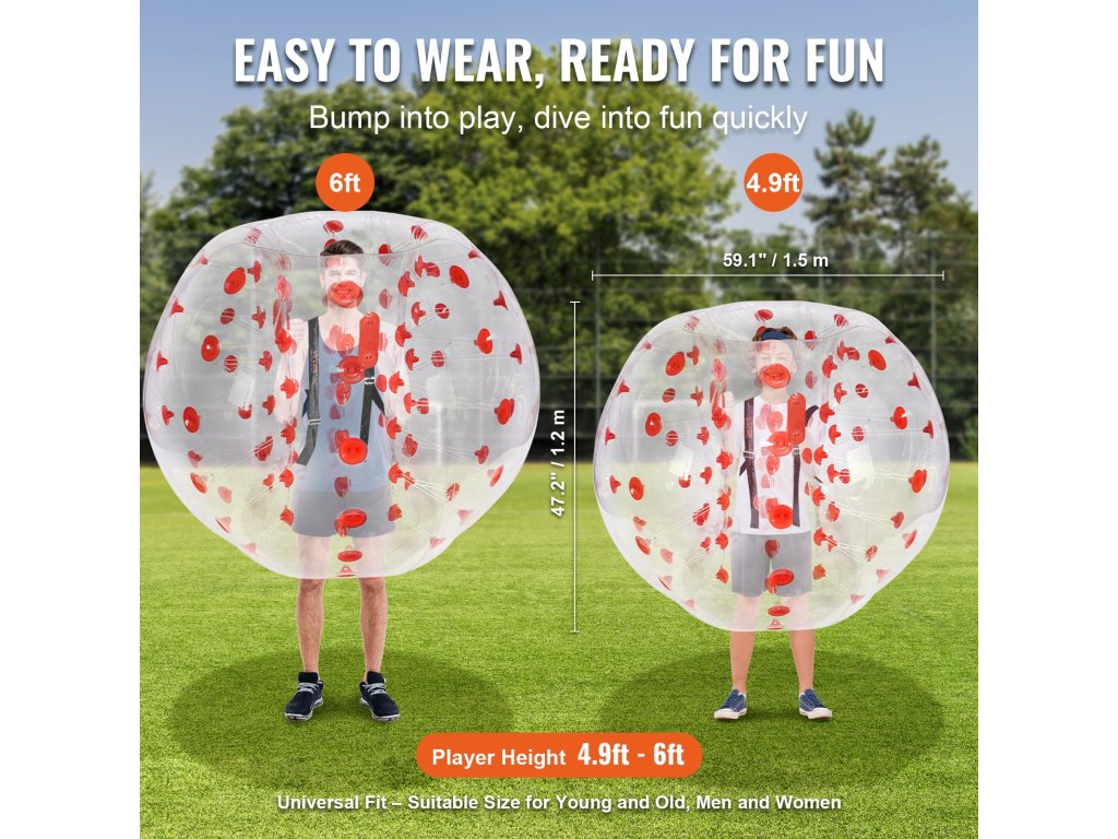 A VEVOR felfújható labdákkal a legnagyobb szórakozást élvezheti. A 0,8 mm vastag, robbanásbiztos PVC-ből készült, 5 láb külső átmérőjű ütközőgolyóinkat a maximális tartósság és biztonság érdekében tervezték. Készüljön fel a becsapódási izgalmakra, és teremtsen felejthetetlen pillanatokat a VEVOR buborékos labdákkal!