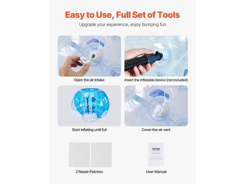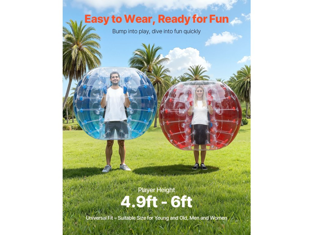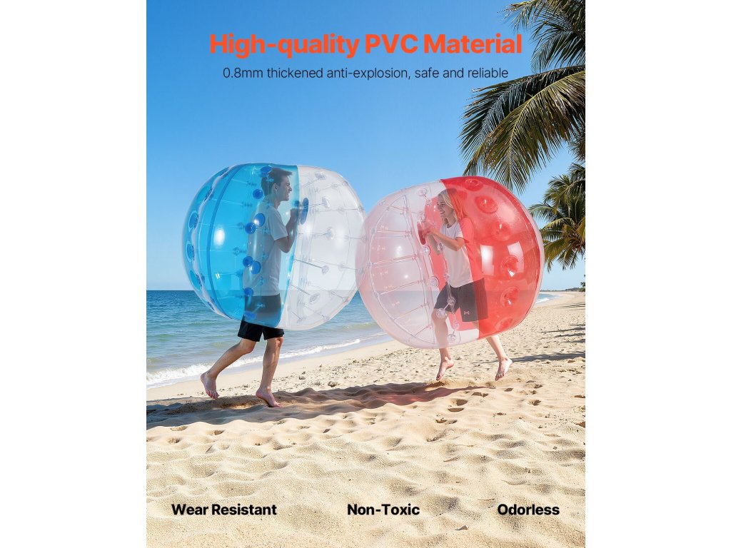 Engedje szabadjára a végső szórakozást a VEVOR 2PCS felfújható labdákkal. A 0,8 mm vastag, robbanásbiztos PVC-ből készült, 5FT külső átmérőjű ütközőgolyóinkat a maximális tartósság és biztonság érdekében tervezték. Készüljön fel a becsapódási izgalmakra, és teremtsen felejthetetlen pillanatokat a VEVOR buborékos labdákkal!