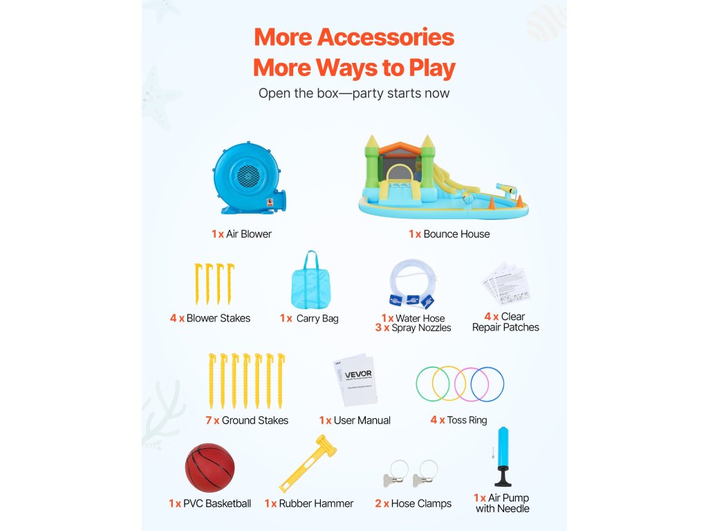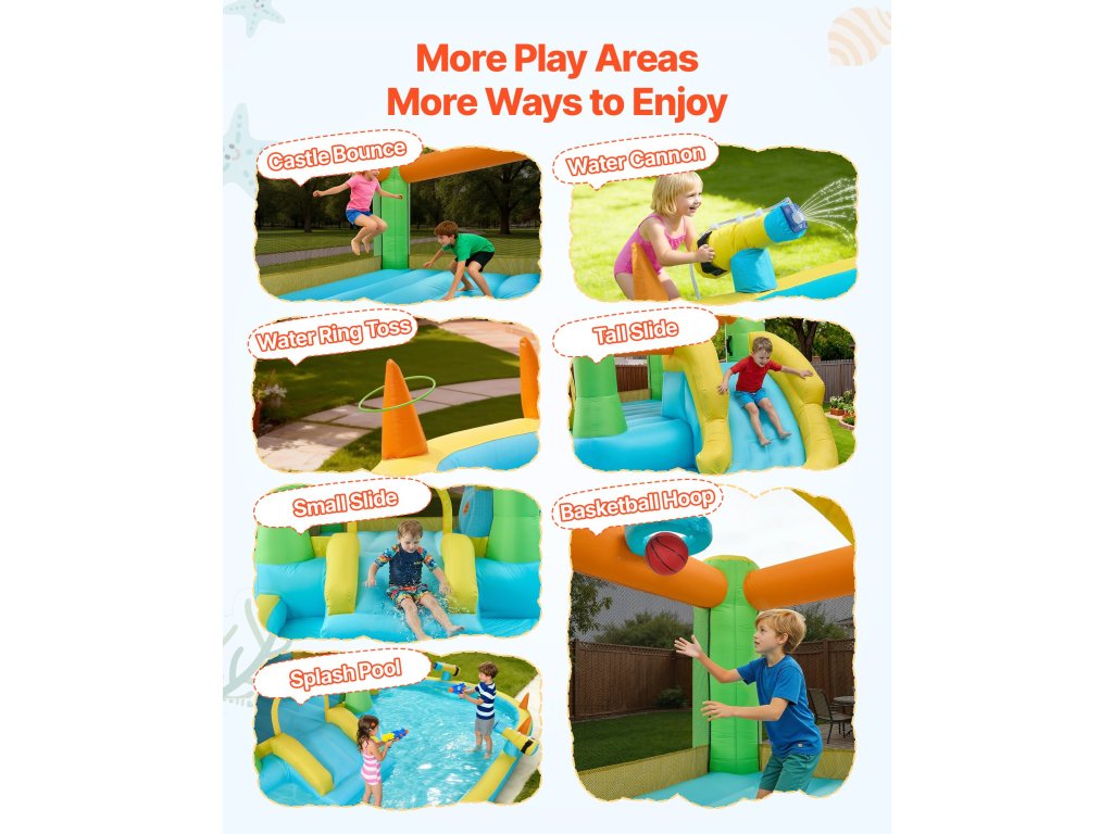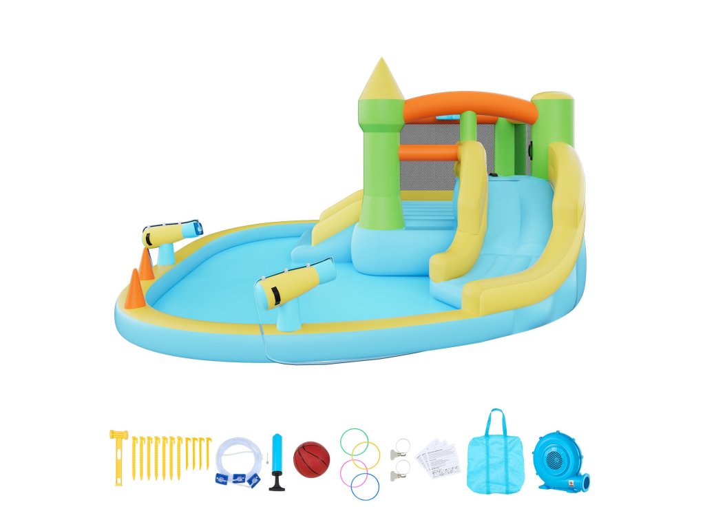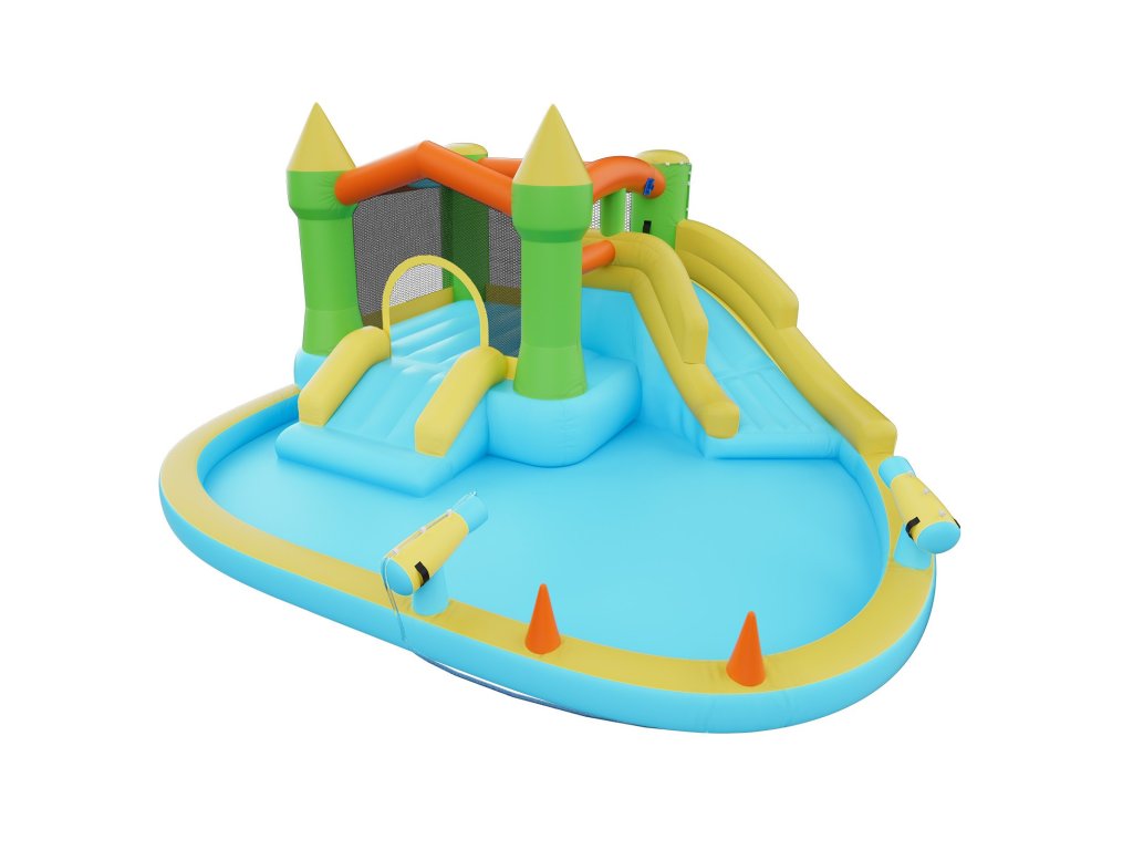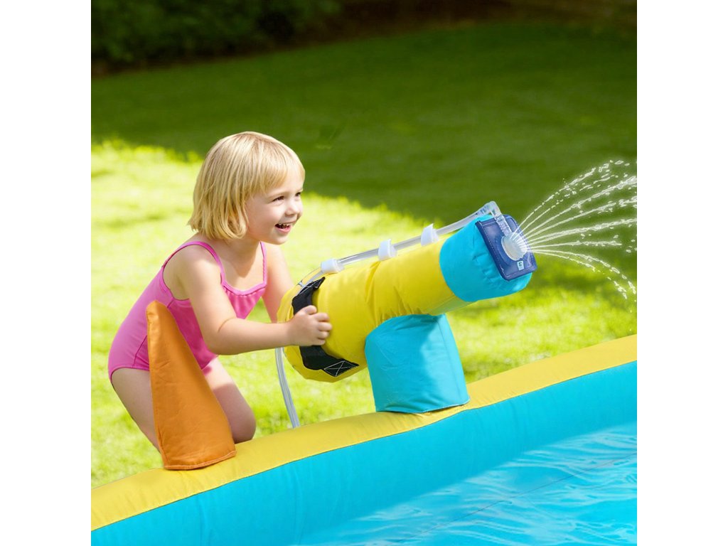 Ez a felfújható vár nagy ugrálóterülettel és sima csúszdával többféle lehetőséget kínál a gyerekeknek és a családoknak a közös szórakozásra. Az innovatív vízgyűrűdobáló játék interaktív szórakozást biztosít, így a gyerekek a szabadban játszva élvezhetik a játékos pillanatokat és a csoportos tevékenységeket a barátaikkal.