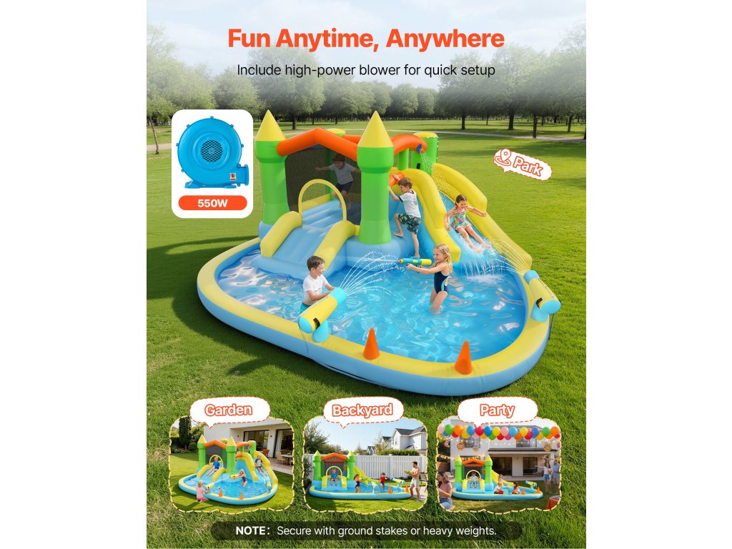 Az egyedi kialakításnak köszönhetően a felfújható ugrálóvár csúszdával alkalmas születésnapi partikra, családi összejövetelekre és nyári udvari rendezvényekre. Folyamatos ugrálást, csúszdázást és kreatív játékot kínál, sok aktív szórakozást nyújtva a gyerekeknek, miközben kellemes pillanatokat szerez a barátokkal és a családdal.