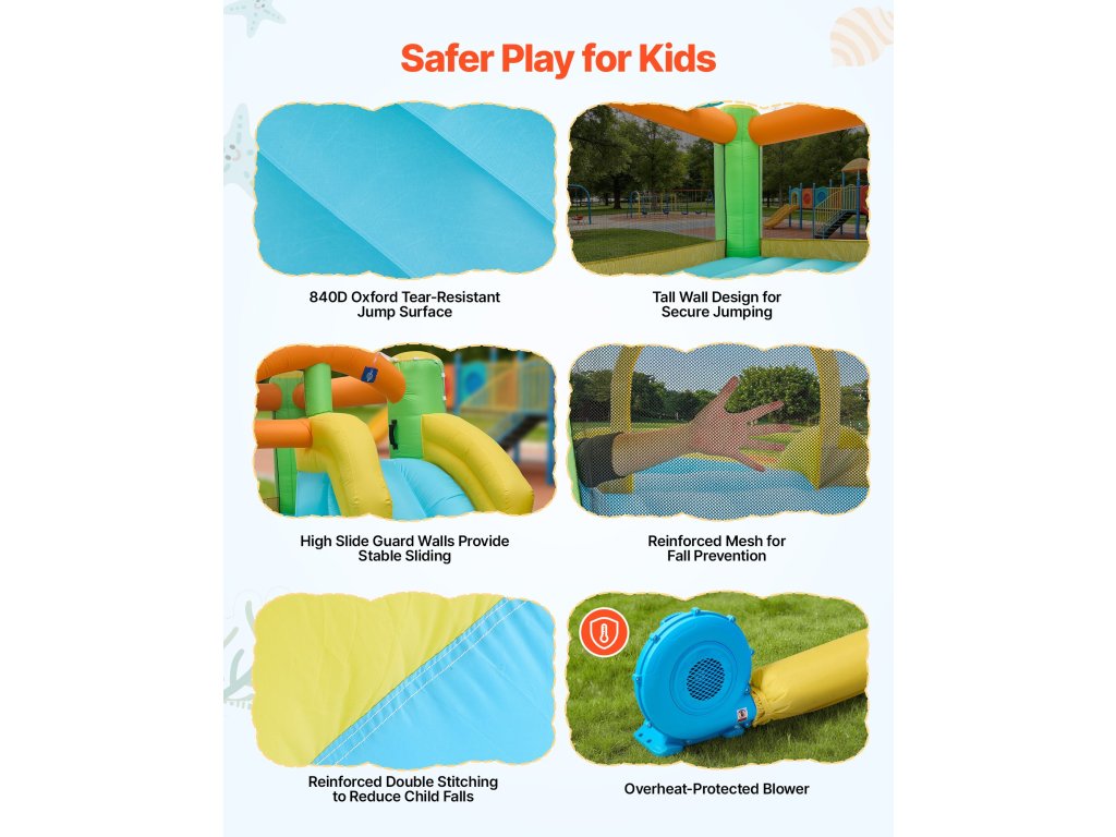 Ez a VEVOR felfújható gyermek vízi park kombinálja a 190T bélést a tartós 840D fényvisszaverő zónával, hogy elősegítse a szilárd általános formát. A kulcsfontosságú hangsúlyozott területeken dupla varrásos technológiát alkalmaznak a varrás erősségének javítása érdekében, ami segít csökkenteni a lyukakat és a gyerekek oldalról való leesésének kockázatát ugrás közben.