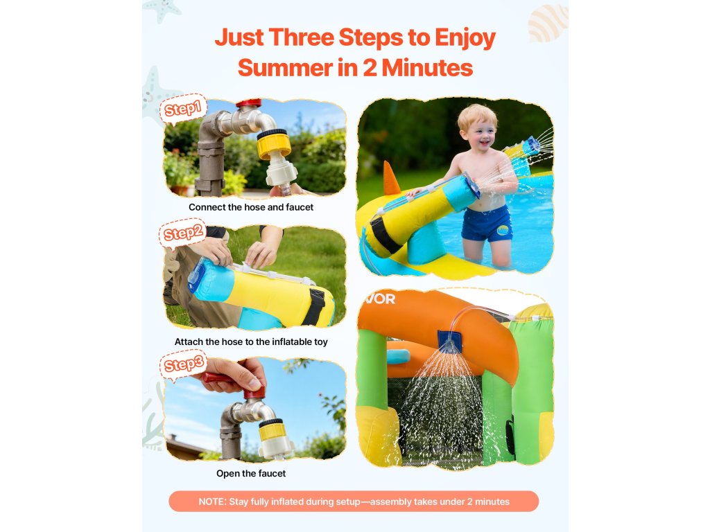 Felfújható vízi várunk könnyen telepíthető és eltávolítható, és felfújása mindössze két percet vesz igénybe. Használat előtt ellenőrizni kell, hogy nincsenek-e éles tárgyak a földön. Tároláshoz kapcsolja ki a felfújót, tekerje fel és tegye egy hordtáskába. A varratmentes javítófoltok egyszerű javítást tesznek lehetővé.