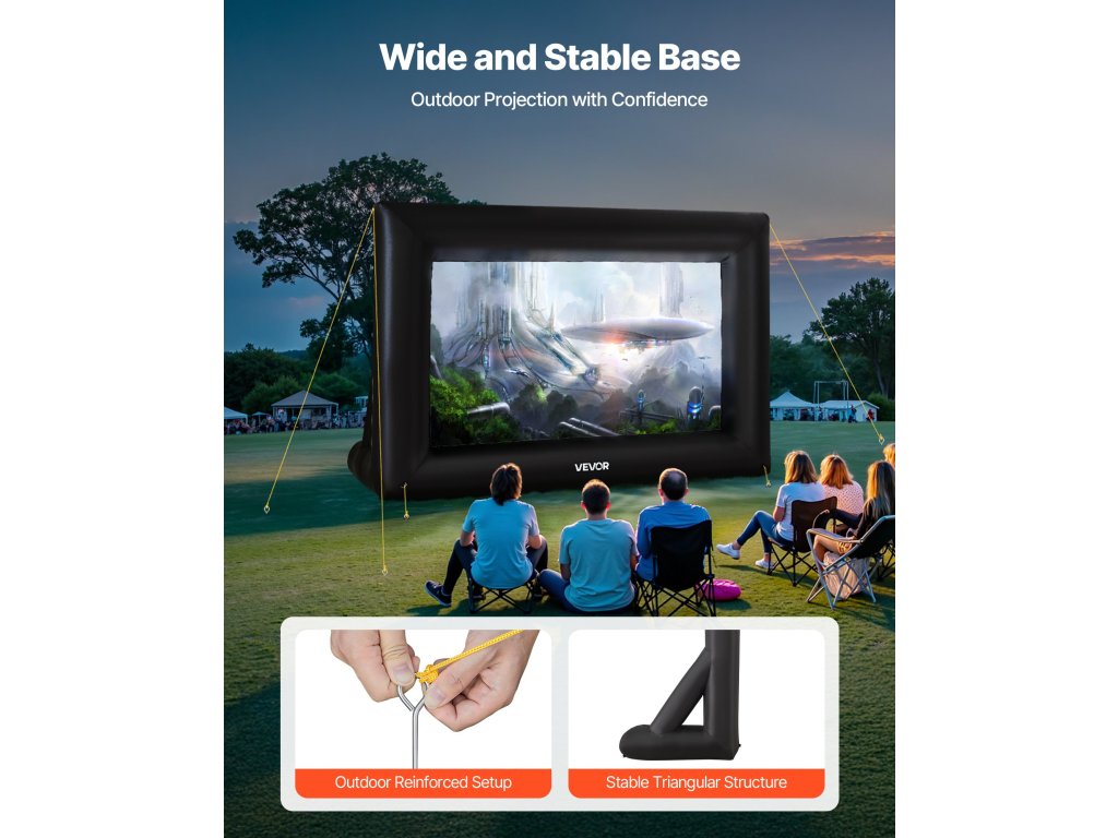 A kerekekkel és kötelekkel ellátott, stabil konstrukcióval rendelkező, biztonságos elhelyezést biztosító vetítővászon stabil támaszt nyújt mind a beltéri, mind a kültéri rendezvényekhez, és minden alkalommal tiszta megjelenítést garantál.