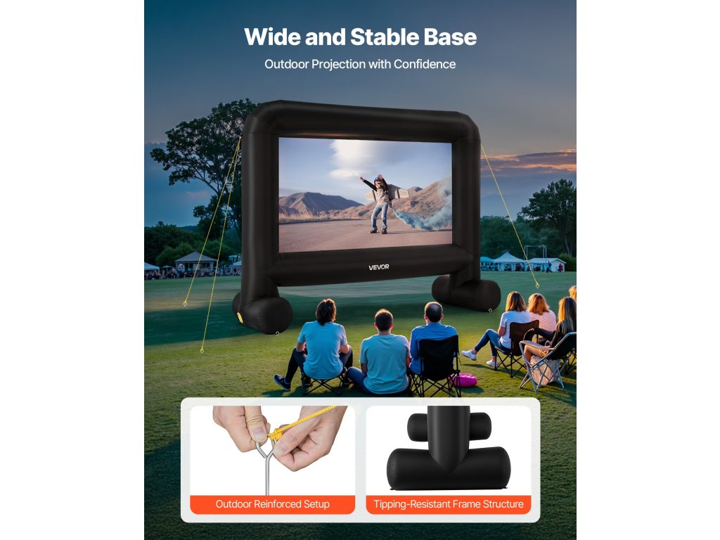 A kerekekkel és kötelekkel ellátott, stabil konstrukcióval rendelkező, biztonságos elhelyezést biztosító vetítővászon stabil támaszt nyújt mind a beltéri, mind a kültéri rendezvényekhez, és minden alkalommal tiszta megjelenítést garantál.