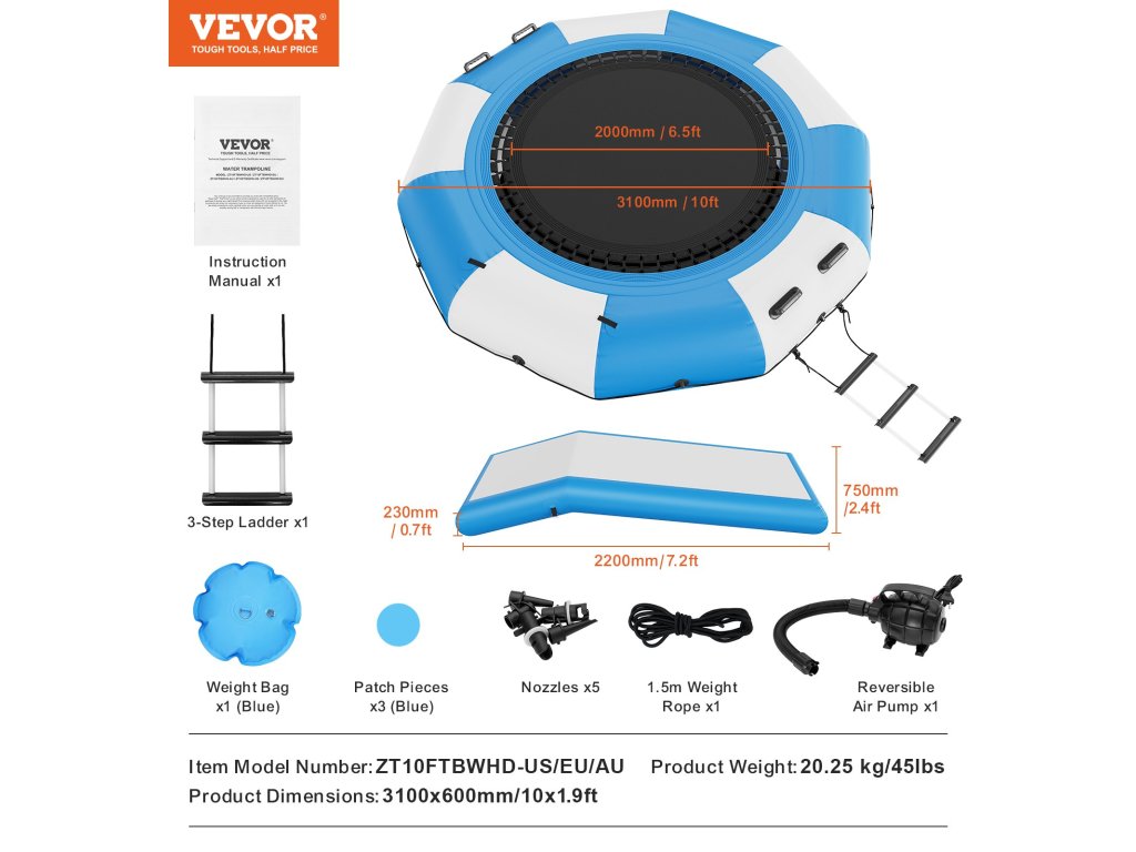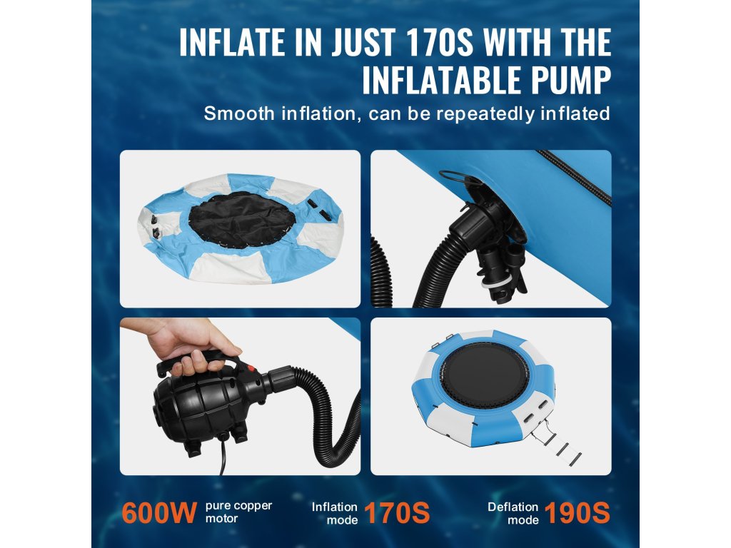600 wattos, tiszta rézből készült motoros felfúvószivattyúval van felszerelve, amely folyamatos felfúvási folyamatot tesz lehetővé. Ennek az úszó trambulinnak az összeszerelése és szétszerelése minimális időt igényel. Miután leeresztette a levegőt, kompakt és könnyű lesz, így könnyen szállítható egyik helyről a másikra.