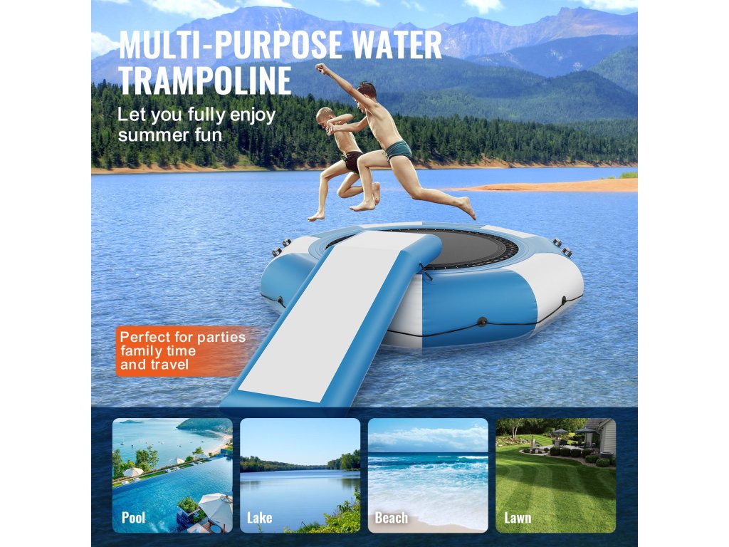 A felfújható vízi trambulin széleskörűen felhasználható, úszáshoz, horgászathoz vagy napozáshoz használható platformként. Csak óvatosan, kerülje az éles tárgyakat.