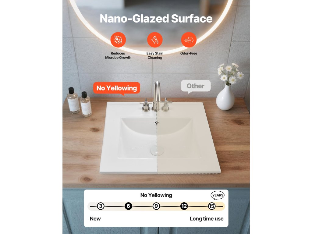 A tartósság érdekében magas hőmérsékleten égetett kerámia mosdókagylót nano mázréteggel vonják be, amely ellenáll a vízfoltoknak, a szappanpenésznek és a karcolásoknak. Idővel fényes és sima marad, így a mindennapi tisztítás gyors és könnyed lesz.