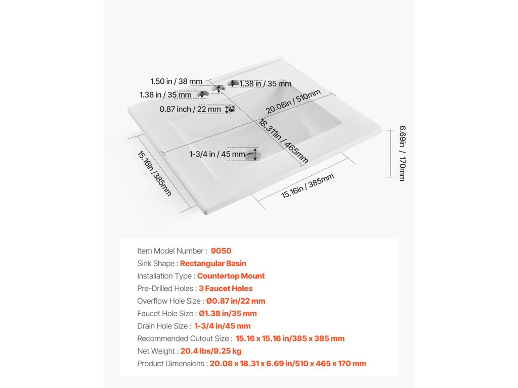 Ez a süllyesztett mosdó pontos kivágásokat igényel a munkalaphoz a felállítás előtt. Javasoljuk, hogy a mosdó tényleges méretei alapján szakszerű mérést és vágást alkalmazzon. Győződjön meg róla, hogy az élek biztonságosan le vannak zárva, hogy megakadályozza a víz beszivárgásából eredő károkat.