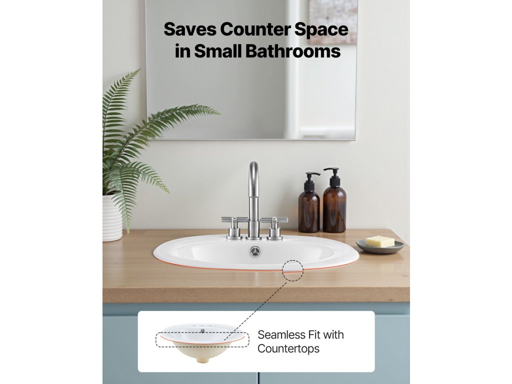 A félig süllyesztett mosdókagyló zökkenőmentesen illeszkedik a munkalapba, kiemelve a praktikus, modern stílust, miközben maximalizálja a fürdőszoba hasznos terét. Alkalmas kis alaprajzú és modern otthonokba.