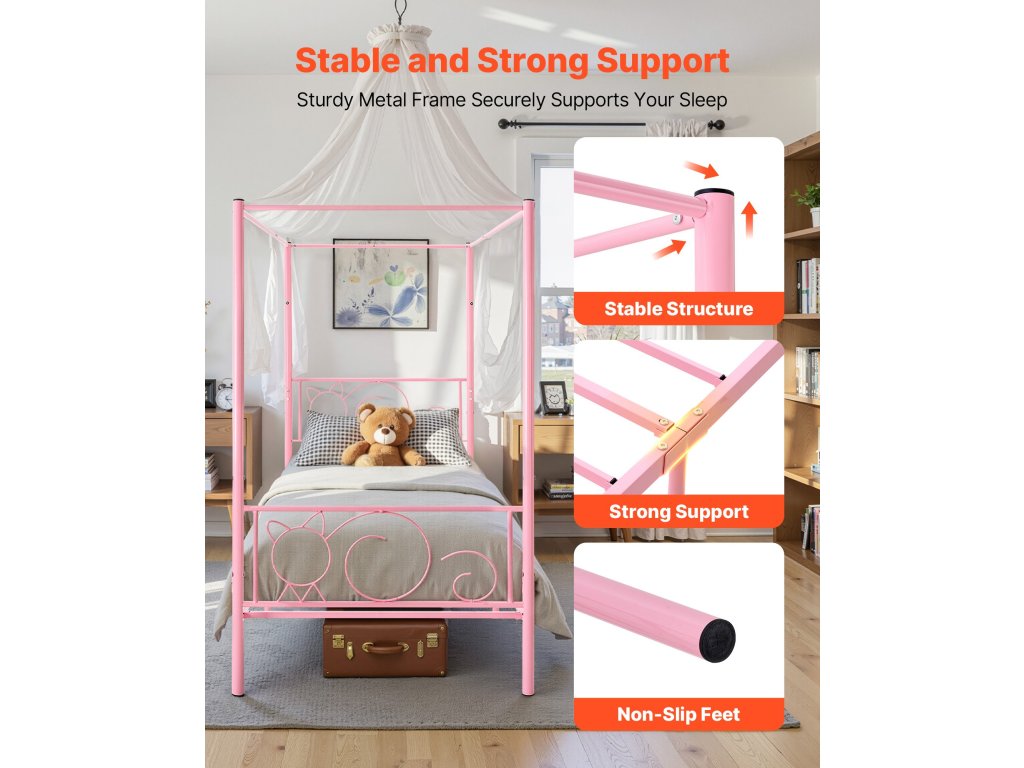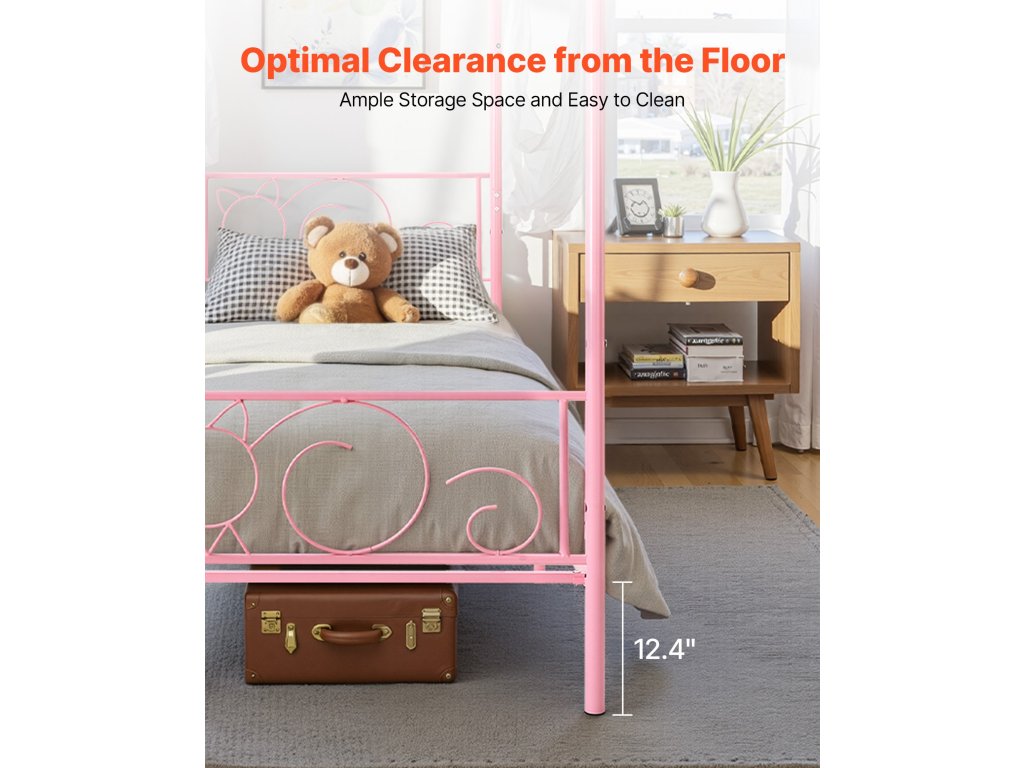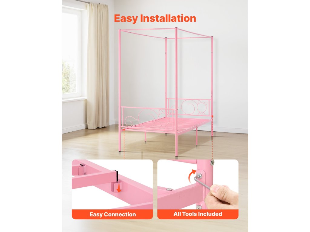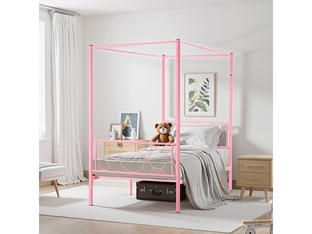 Fém baldachinos franciaágy, tároló, lécek, rózsaszín