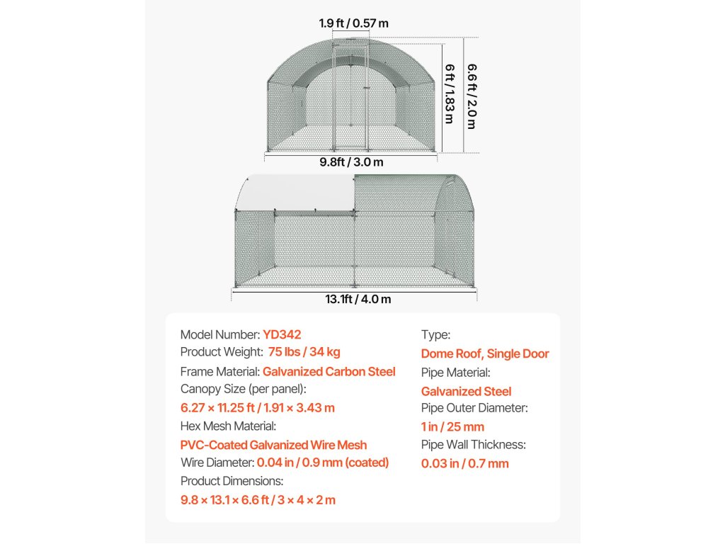 Fém csirkefuttató 9,8 × 13,1 × 6,5 láb, átjárható, zárral