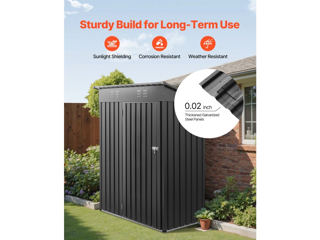 A VEVOR 58,2 m3-es fém tárolóház (60,35 x 34,49 x 71,46 hüvelyk / 1533 x 876 x 1815 mm) ideális kerti szerszámok és egyéb tárgyak tárolására. Horganyzott acélból készült, tartós, vízálló és ellenáll a napfénynek. A ferde tető megakadályozza a hó felhalmozódását, 30 kg/m² teherbírású. Szellőzéssel és zárható ajtóval rendelkezik.