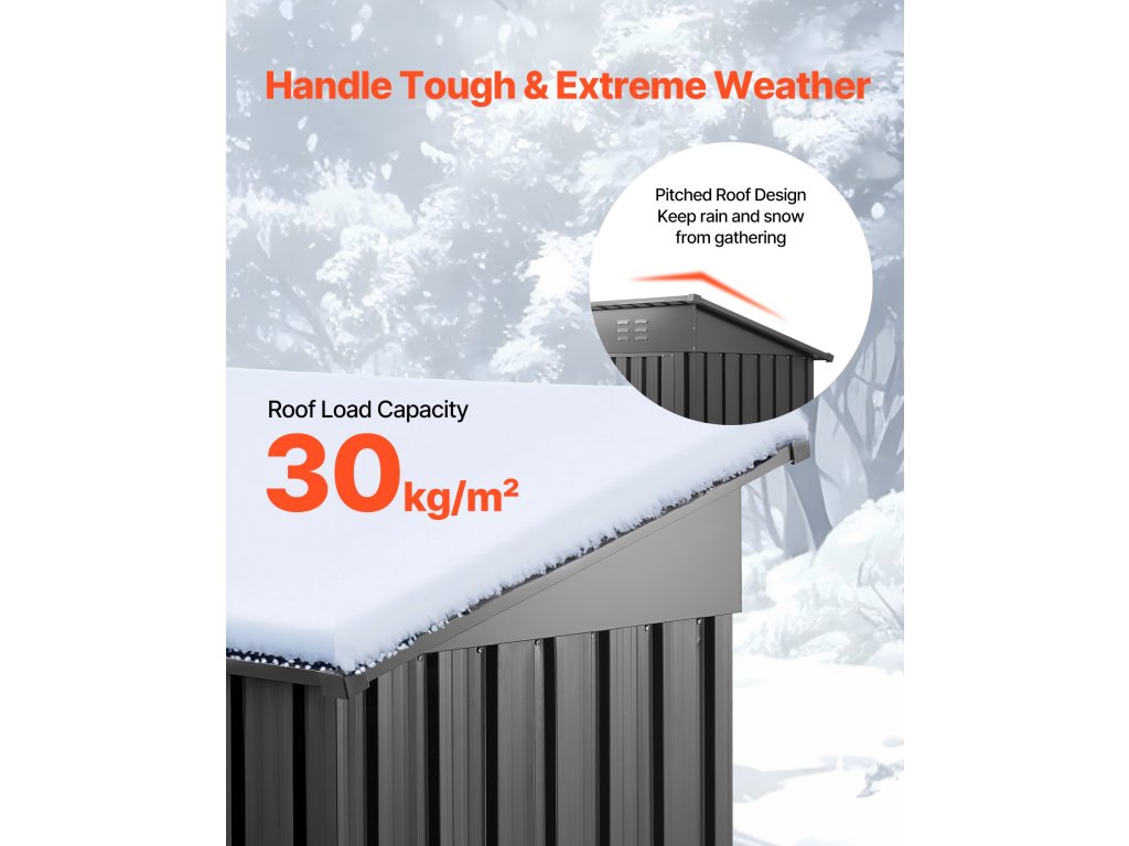 Kültéri tárolóházunk prémium minőségű fémből készült, így biztosítva, hogy ellenálljon a zord időjárási körülményeknek. A ferde tető kialakítása megakadályozza a hó és a víz felgyülemlését, és akár 30 kg/m² terhelhetőséget is biztosít. Hosszú ideig tartó kültéri használat esetén is stabil és deformációálló marad, így egész évben megbízható tárolást biztosít.