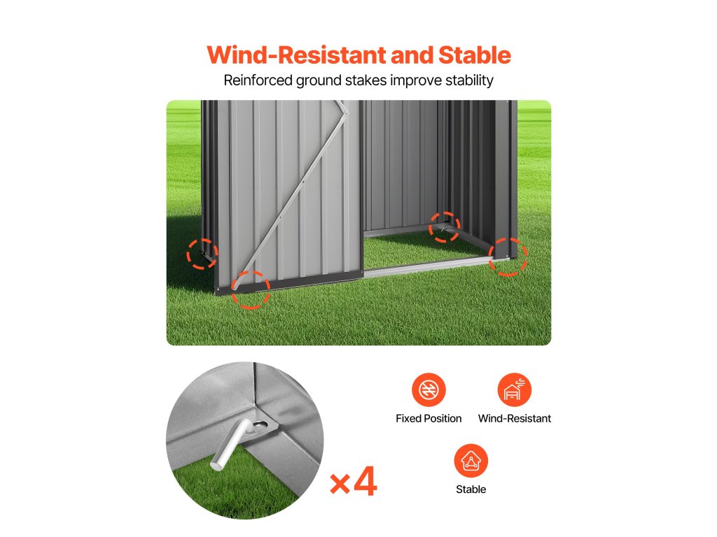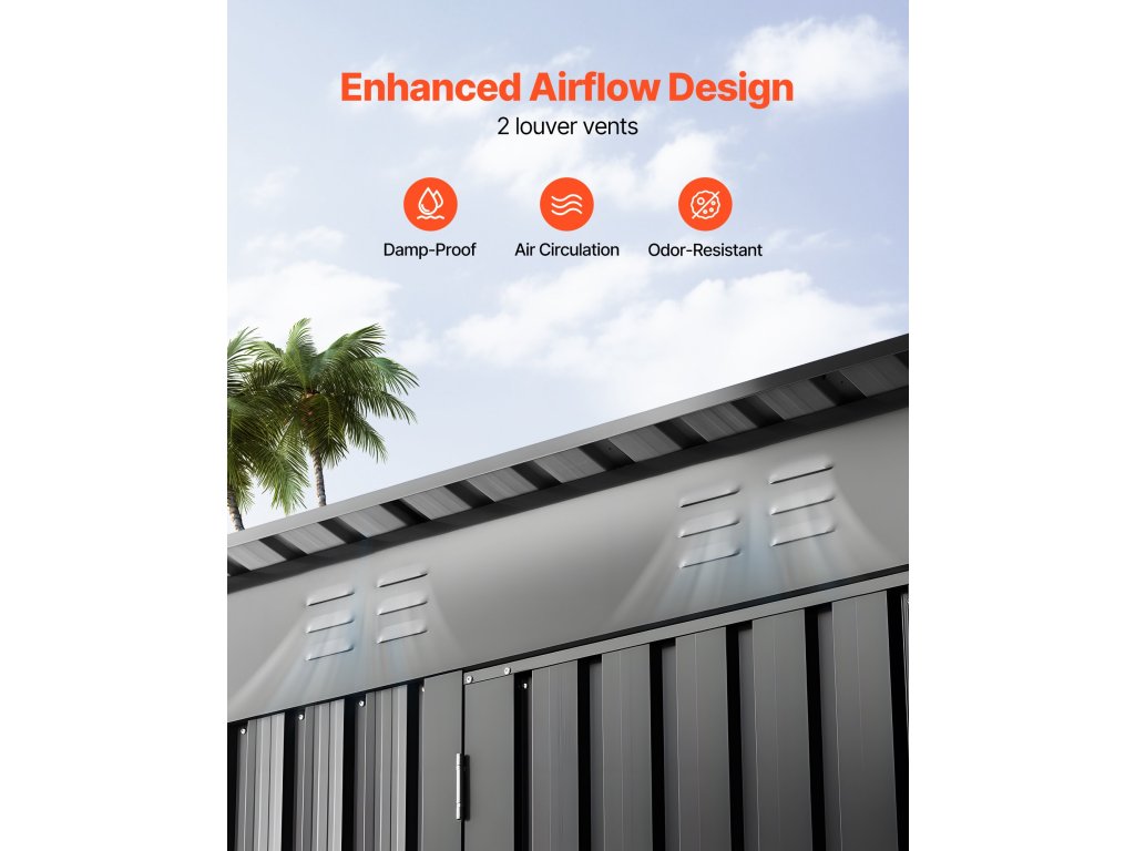 A további biztonság és kényelem érdekében ez a fém fészer és kültéri tárolóhely zárható ajtózárral rendelkezik. A szellőzőnyílások megakadályozzák a nedvességet, és a rozsdamentes acél zsanérok biztosítják az ajtó zökkenőmentes működését. A csúszásmentes sarkok megakadályozzák a karcolásokat és zökkenőmentes használatot biztosítanak.