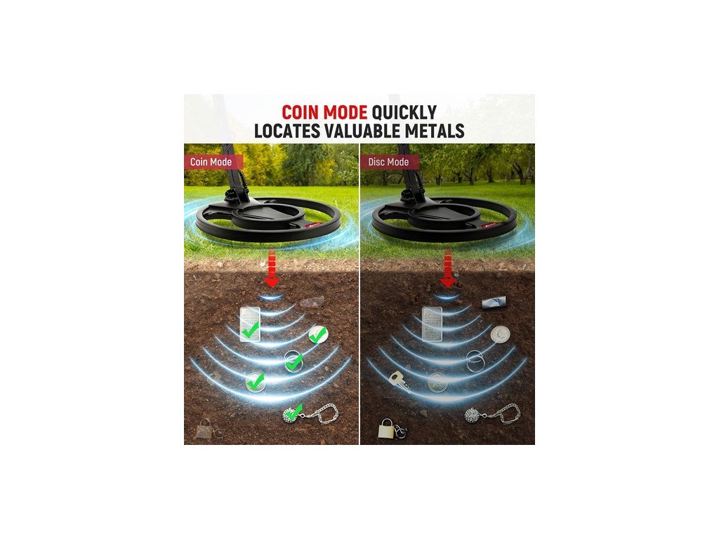 A KAIWEETS fémdetektor 6 továbbfejlesztett üzemmóddal rendelkezik. ① Minden fém üzemmód. ② Korong üzemmód: A nem kívánt fémcélok fokozatos eltávolítása. ③ Bevágás üzemmód: A nem kívánt fémcélok eltávolításának testreszabása. ④ Memória mód: Egyetlen megjegyzett fémcélpont felismerése. ⑤ Érme üzemmód: Ilyenkor csak érmék érzékelhetők. ⑥ Pinpoint mód: Pontos célpont lokalizáció.