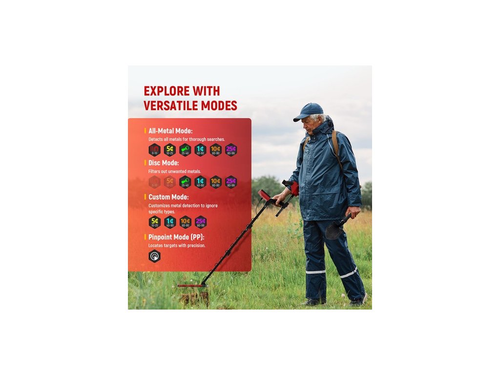 A KAIWEETS fémdetektor 4 továbbfejlesztett üzemmóddal rendelkezik. ① Minden fém üzemmód. ② Korong üzemmód: A nem kívánt fémcélok fokozatos eltávolítása. ③ Bevágás üzemmód: A nem kívánt fémcélok eltávolításának testreszabása. ④ Pinpoint mód: Pontos célpontlokalizáció a különböző terepviszonyokhoz és céltípusokhoz való alkalmazkodáshoz a hatékony kincsvadászat érdekében.