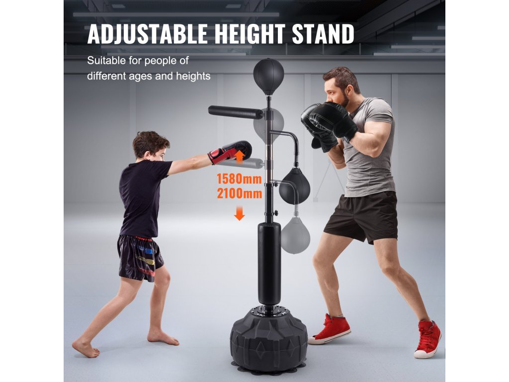 A boxzsák készlethez állvány tartozik, amely különböző korú és magasságú emberek számára alkalmas, a gyermekek testméretének megfelelően állítható.