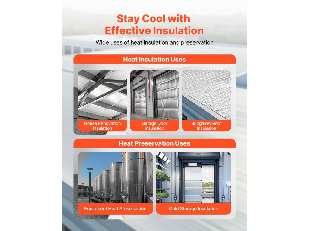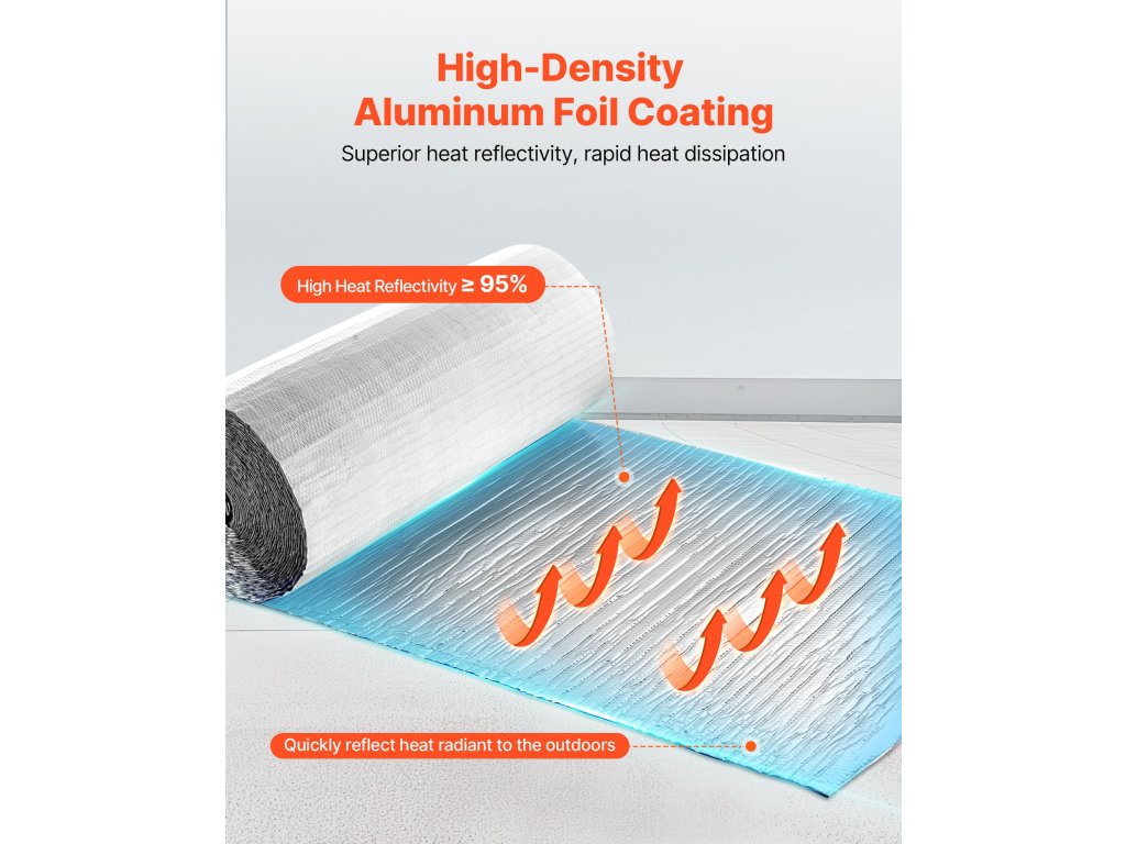 A VEVOR fényvisszaverő szigetelő tekercs ≥ 95%-os fényvisszaverő képességgel rendelkezik, és fényvisszaverő alumíniumfóliából, kétrétegű légbuborékokból és fehér PE-fóliából készül. Nyáron blokkolja a napfényt, télen pedig megakadályozza a hőveszteséget, így fenntartva a kellemes belső hőmérsékletet.