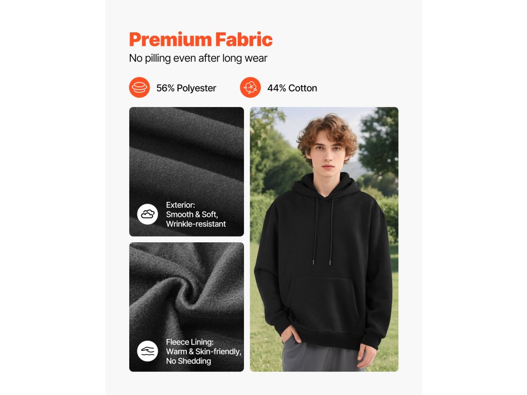 56% poliészter és 44% pamut keverékét használjuk. A pulóver fleece bélése bezárja a hőt és puha a bőrön - tökéletes a hideg őszi és téli napokon.