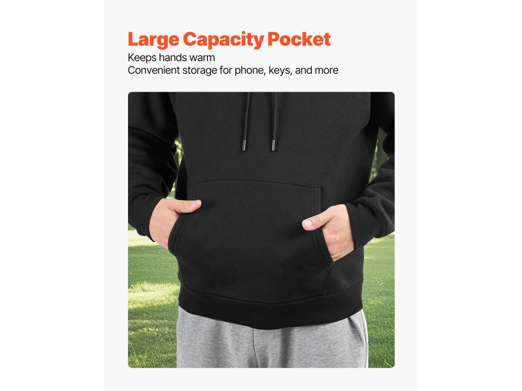 Tágas elülső zsebbel rendelkezik a kisebb tárgyak számára. A dupla varrású varrások növelik a tartósságot, míg a rugalmas mandzsetták és a szegély segít a melegen tartásban.