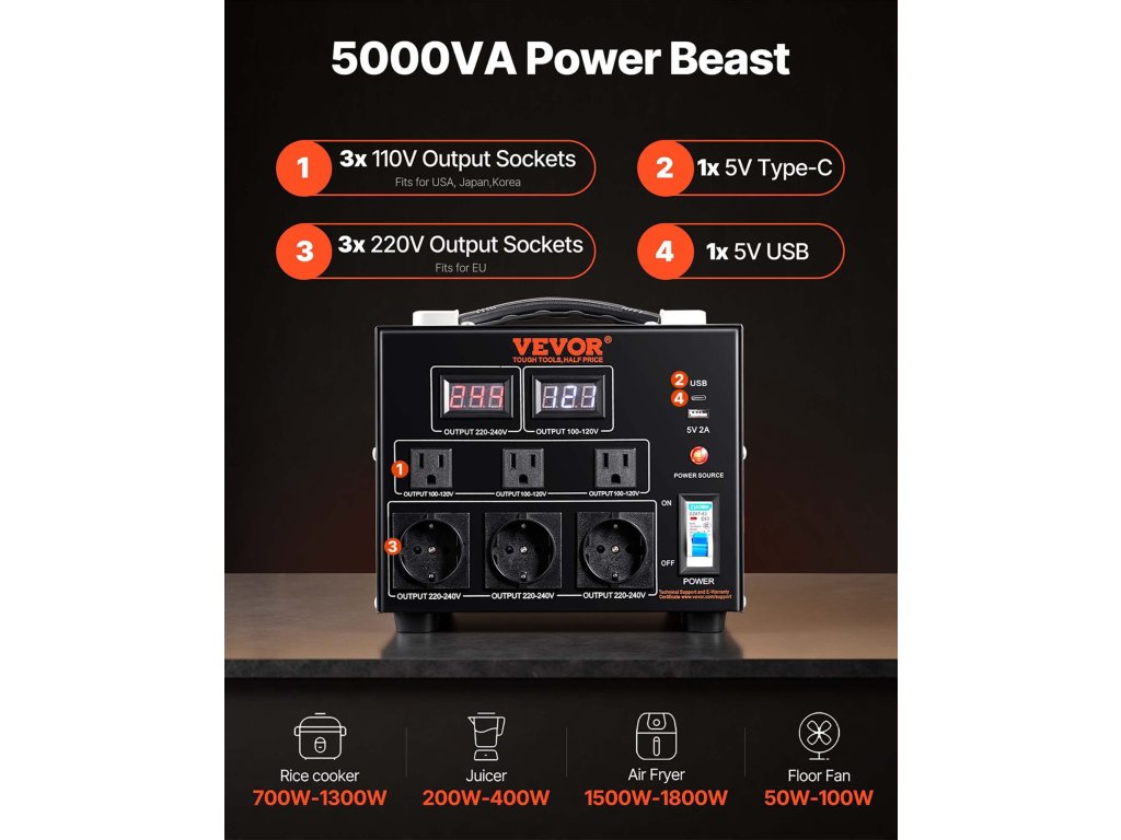 Ez az 5000 W-os átalakító fokozatmentes teljesítménycsökkentéssel rendelkezik, és 3 amerikai 3-tűs NEMA 5-15R kimeneti csatlakozót, 3 európai Shucko kimeneti csatlakozót, 1 USB-csatlakozót és 1 Type-C csatlakozót kínál több eszköz egyidejű használatához.