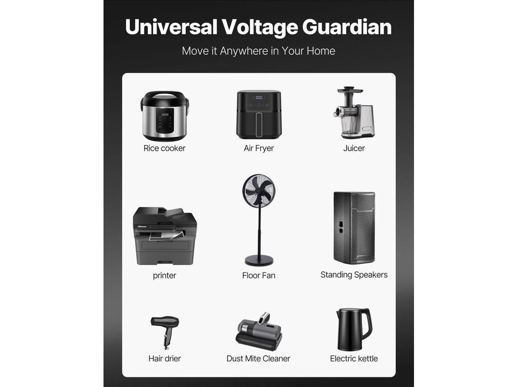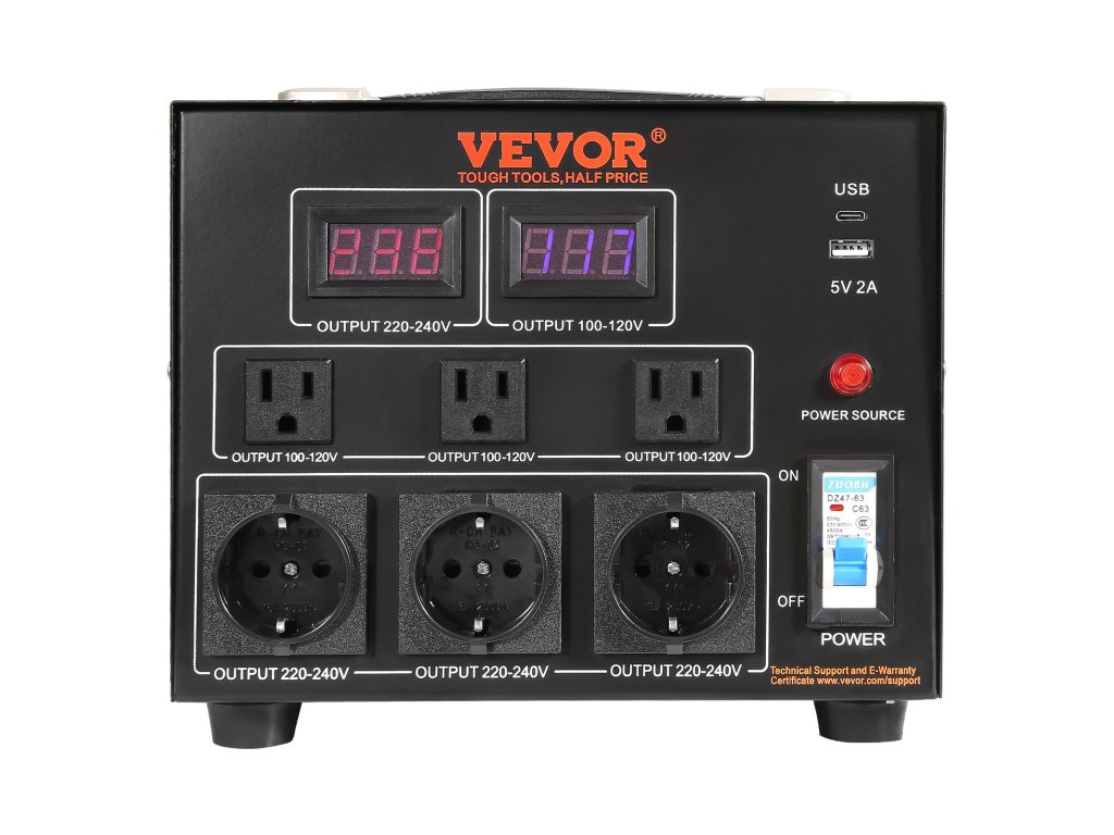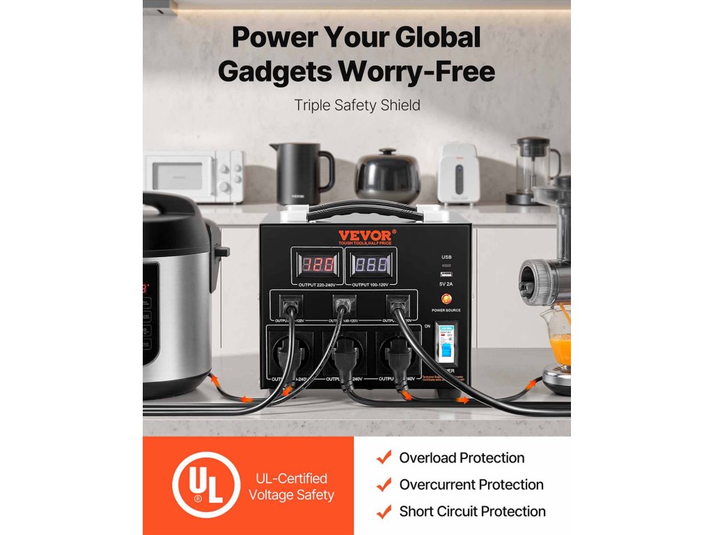 Ez az új VEVOR transzformátor kétirányú 110V/220V feszültségátalakítást valósít meg, a legtöbb országban alkalmazható feszültségcserére, így az otthoni készülékeket külföldön is használhatja. 8 aljzattal rendelkezik, amelyek akár 8 csatlakoztatott eszköz egyidejű használatát is támogatják.