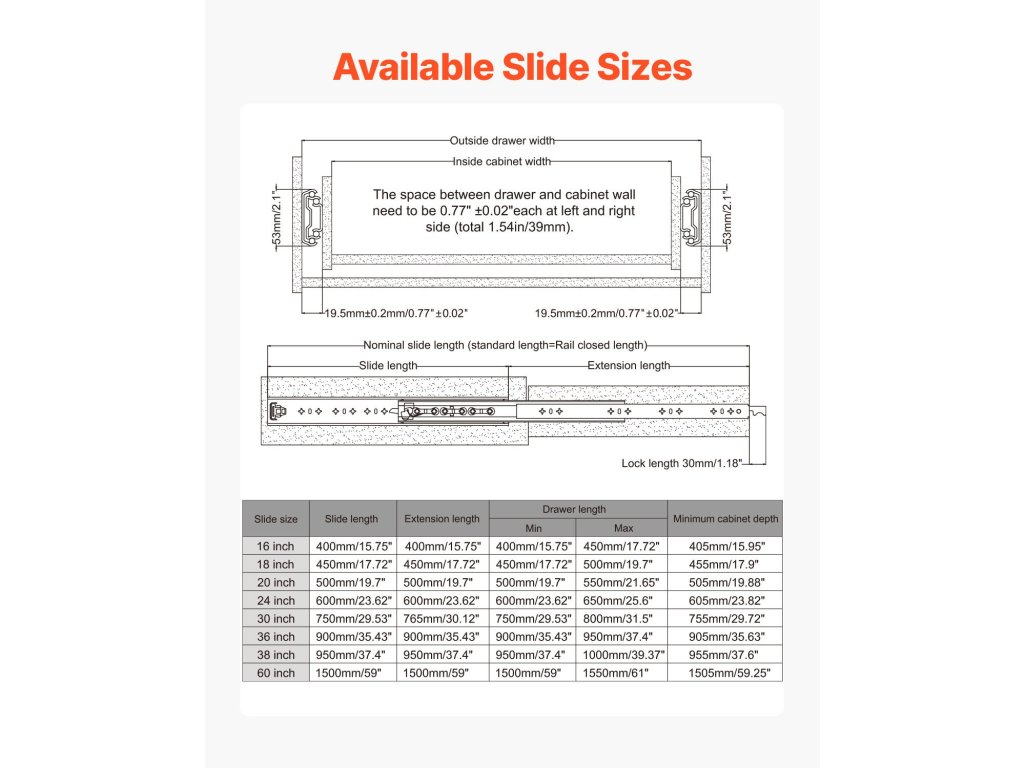 Fiókcsúszka-készlet 250 font, golyóscsapágy, 16-60 hüvelyk