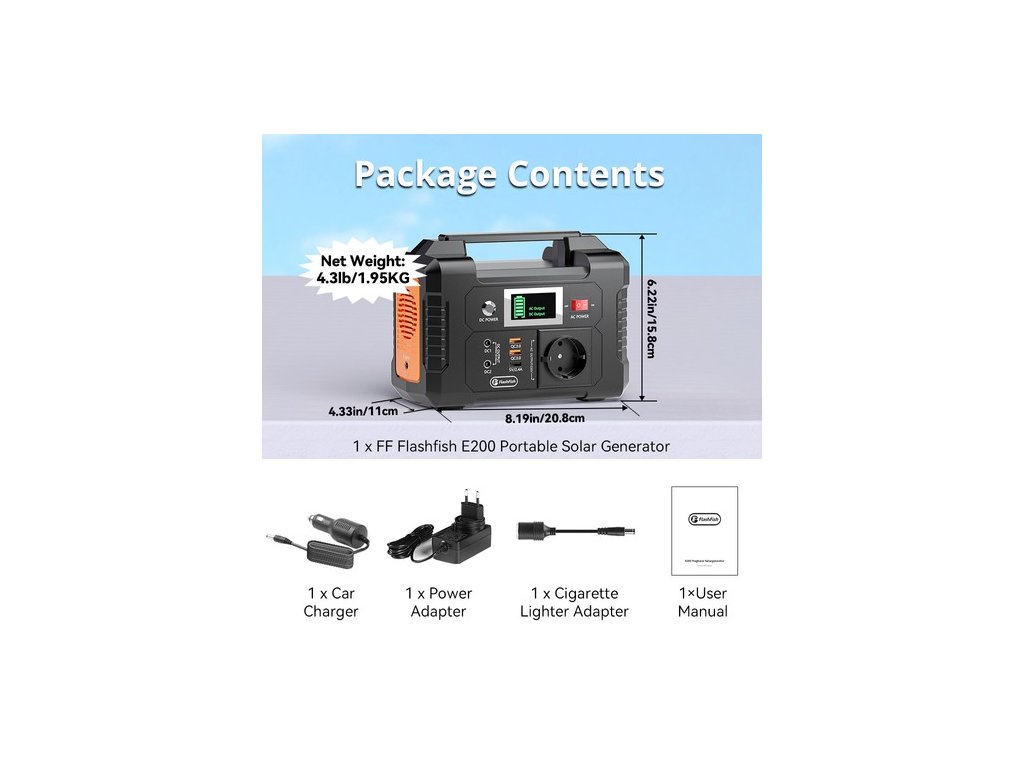 A csomag tartalmaz 1x hordozható FlashFish E200 tápegységet, 1x hálózati adaptert, 1x szivargyújtó adaptert, 1x autós töltőt, 1x használati útmutatót.