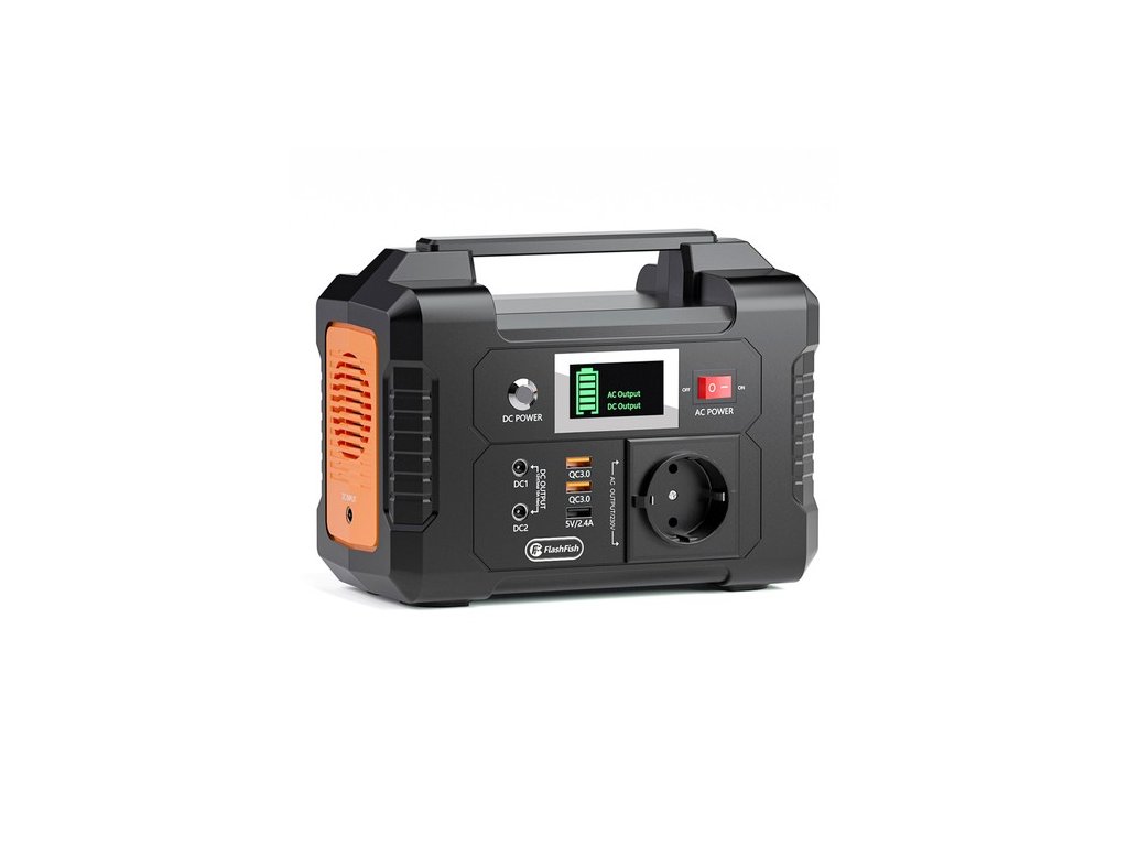 A FlashFish erőmű lítium akkumulátorral van felszerelve, és 15-24 V-os napelemmel, illetve AC konnektorral vagy autós aljzattal tölthető, így az útközbeni rugalmasságot növeli. A többfunkciós, ultra-fényes LCD-kijelző intuitív és világos képet nyújt a maradék akkumulátor/töltés/kisülés/AC kimenet/DC kimenet állapotáról még gyenge fényviszonyok mellett is.