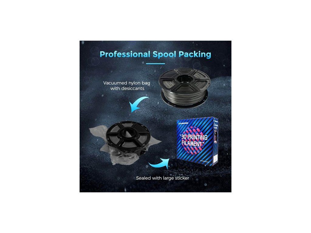 Dugulásmentes munkával tervezték és gyártották, hogy garantálja a problémamentes és stabil nyomtatást ezekkel a PLA szálakkal. Csomagolás előtt 24 órán keresztül teljesen megszárítják őket, és vákuumzárral, nedvszívószerekkel újrazárható nejlonzacskóba zárják.