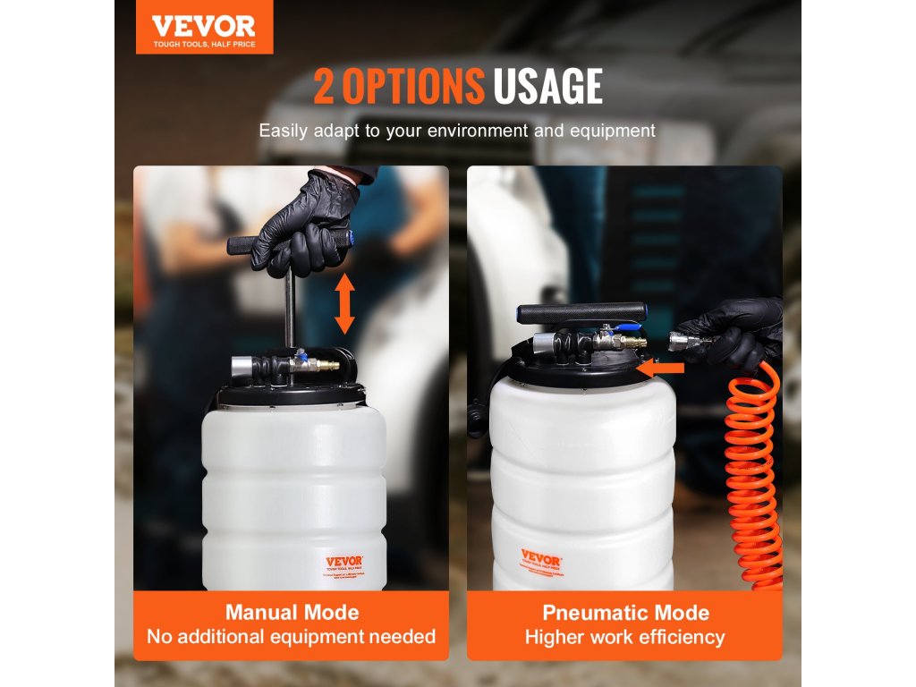 Ez a folyadékelszívó kézzel és pneumatikusan is működik. A pneumatikus üzemmód felgyorsítja a folyamatot, míg a kézi üzemmód egyszerűbbé teszi a dolgokat, és nem igényel további berendezéseket.