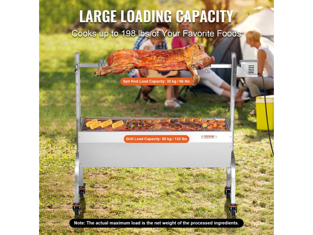 Ez a rotisserie grillkészlet akár 198 kg-os terhelést is képes megforgatni, így ideális egész állatok sütéséhez. Válassza ki a megfelelő grillhálót a különböző húsok számára, amely bőséges helyet kínál minden igényének.