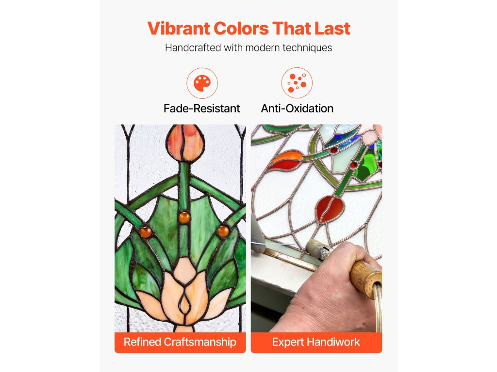 Ez az ólomüveg ablakpanel több mint egyszerű dekoráció, ez egy funkcionális műalkotás. Fakulásálló, élénk színű üvegből készült, és kiválóan alkalmas ablakokba, falakra vagy kis sarkokba - zökkenőmentesen adja hozzá a művészi bájt, bárhol is lógjon.