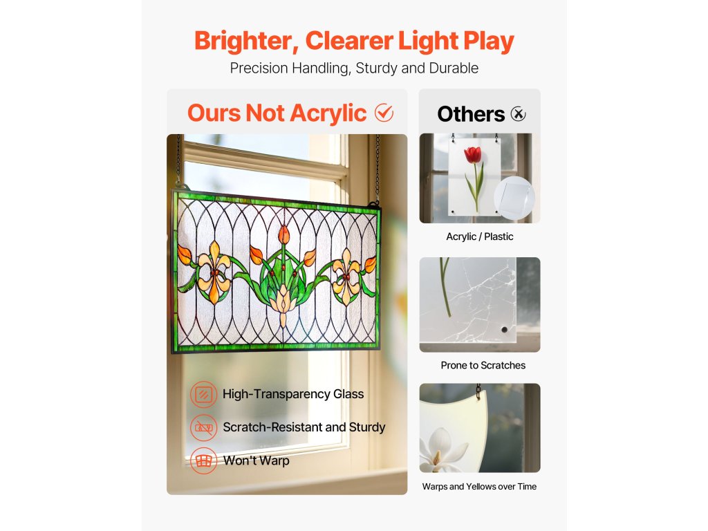 Ez a lógó ólomüveg panel úgy lett kialakítva, hogy elzárja a kilátást kívülről, így a szoba világos marad, miközben elzárja a kíváncsi tekinteteket - ideális az utcára vagy a szomszédokra néző ablakokhoz. Emellett segít megelőzni a madárcsapásokat, és finom biztonsági rétegként is működik.