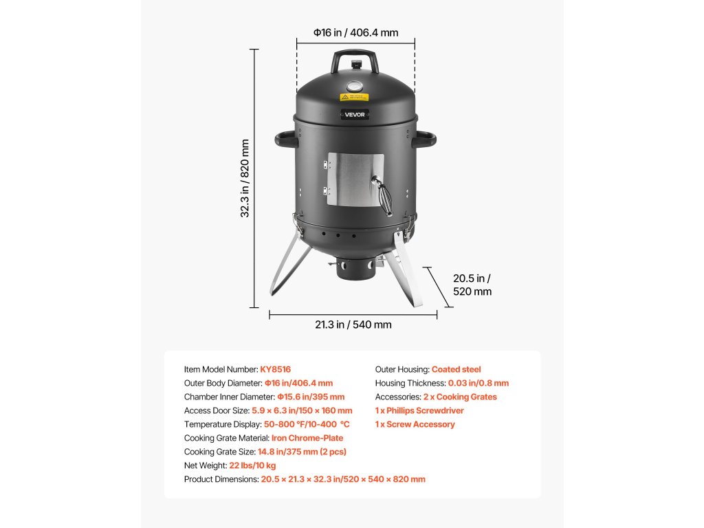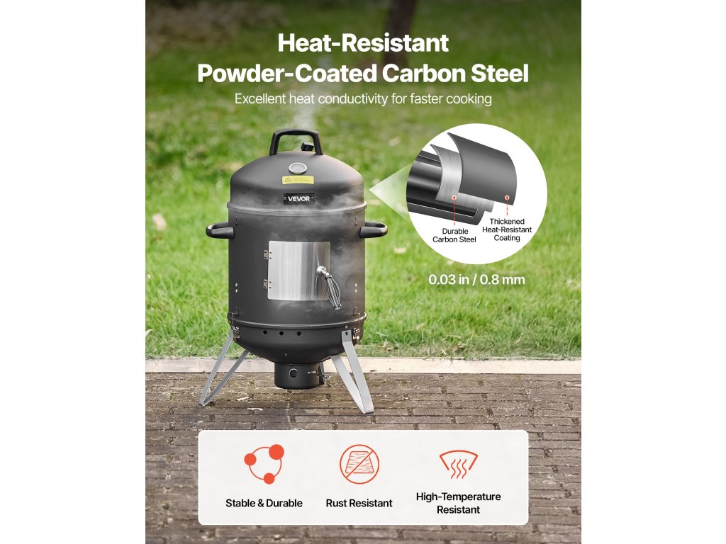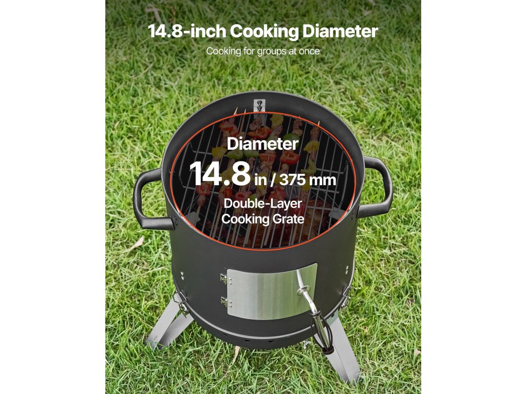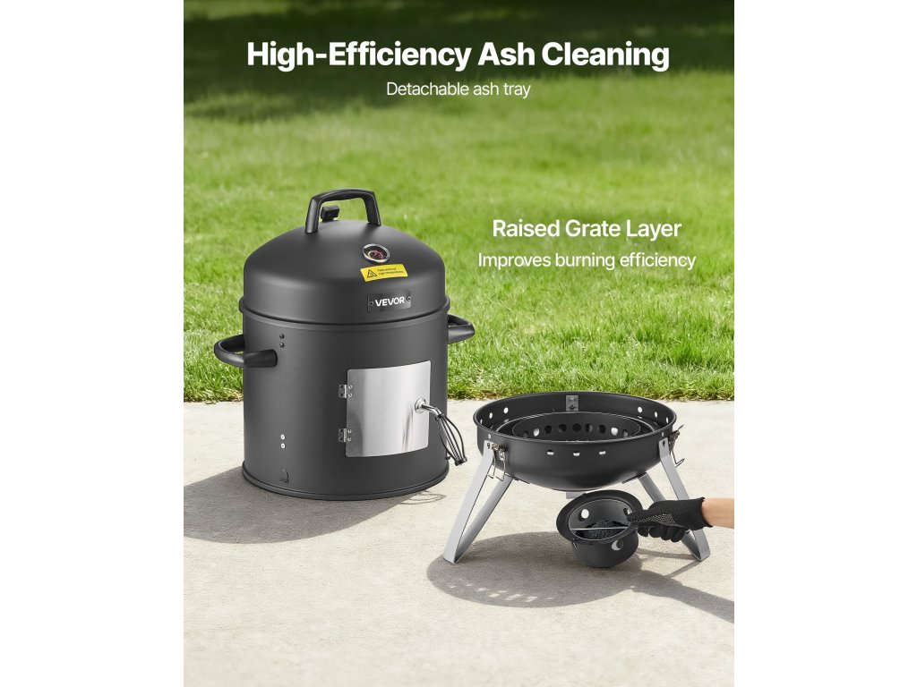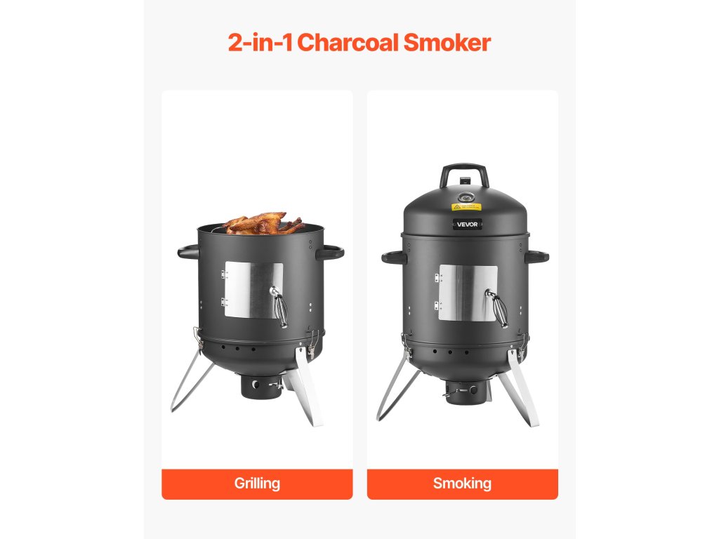 Élvezze az autentikus faszenes füstölést a VEVOR 16"-os faszenes füstölő és grill készülékkel, amelynek 2 grillrácsa egyszerre többféle étel elkészítésére is alkalmas. Nyitott fedéllel grillként is használható az ételek közvetlen hővel történő elkészítéséhez, míg csukott fedéllel füstölővé alakul, hogy húsai gazdag, füstös ízt kapjanak.
