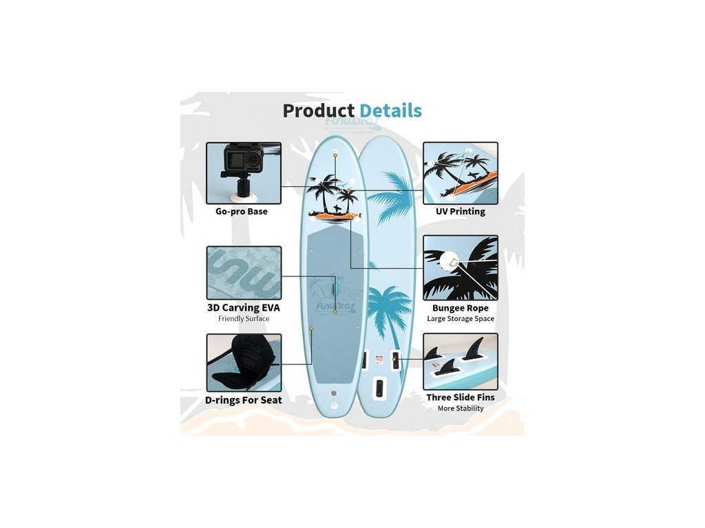 | A csomag tartalma: | 1 x hátizsák, 3 x uszony, 1 x kézi szivattyú, 1 x szíj, 1 x Stand Up Paddle Board, 1 x Vízálló táska, 1 x póráz, 1 x Evező, 1 x SUP ülés |