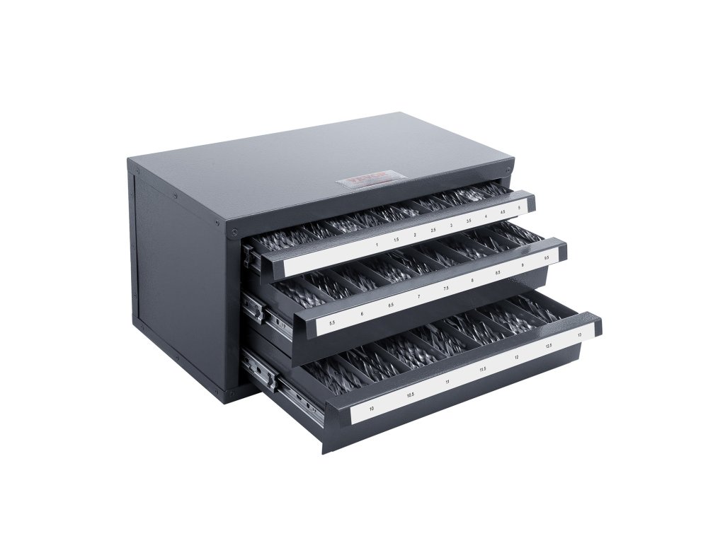 Ez a fúrószár-tárolószekrény három tágas fiókkal rendelkezik, amelyekben 1 mm-től 13 mm-ig terjedő fúrószárak találhatók, összesen 29 rekeszben. Minden rekeszbe egy fúrószár vagy egyéb tartozék fér el. Ezek a rekeszek tiszta pozíciókat biztosítanak a különböző méretek és típusok számára.