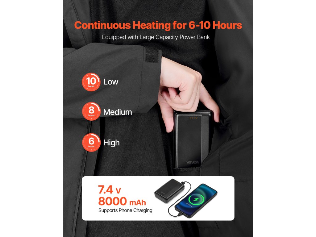 Az állítható kapucni, mandzsetta és szegély szélvédelmet biztosít, míg az egyszerű, egygombos működtetés és a 8000 mAh-s akkumulátor miatt ez az USB-s fűthető kabát ideális a mindennapi használatra.