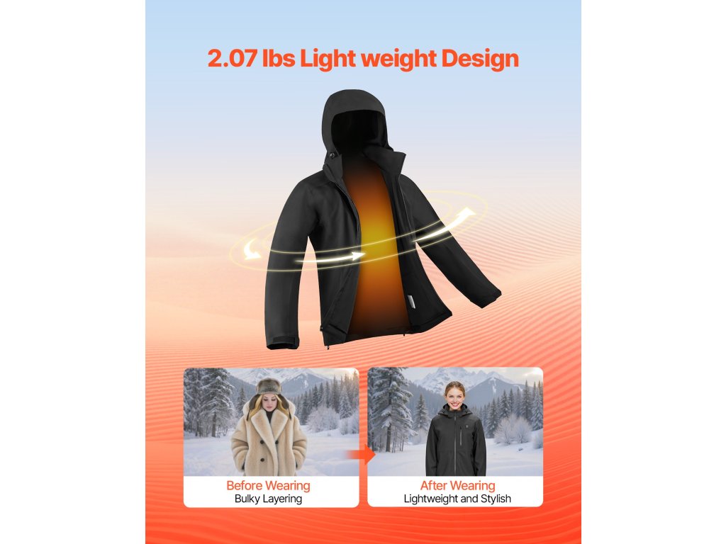 5 szénszálas fűtőzónával rendelkezik (karok, has, hát) 3 hőfokozattal 140℉-ig. Egy 7,4 V-os 8000 mAh-s akkumulátorral működik, amely 6-10 óra hőt biztosít. Vízálló anyagból készült, alkalmas túrázáshoz, kempingezéshez, síeléshez, horgászathoz és vadászathoz.