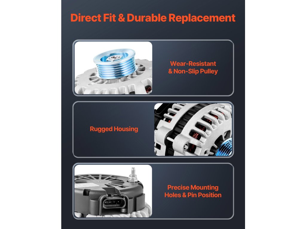 Csere generátorunk tiszta réz tekercsekkel rendelkezik, amelyek az alumíniumnál jobb tartósságot biztosítanak. Az alumínium ház és a hűtőventilátor növeli a hőelvezetést. Stabil 150 amperes kimenetet biztosít a nagy terhelésű berendezések, például a légkondicionáló és a prémium audio rendszerek támogatásához.